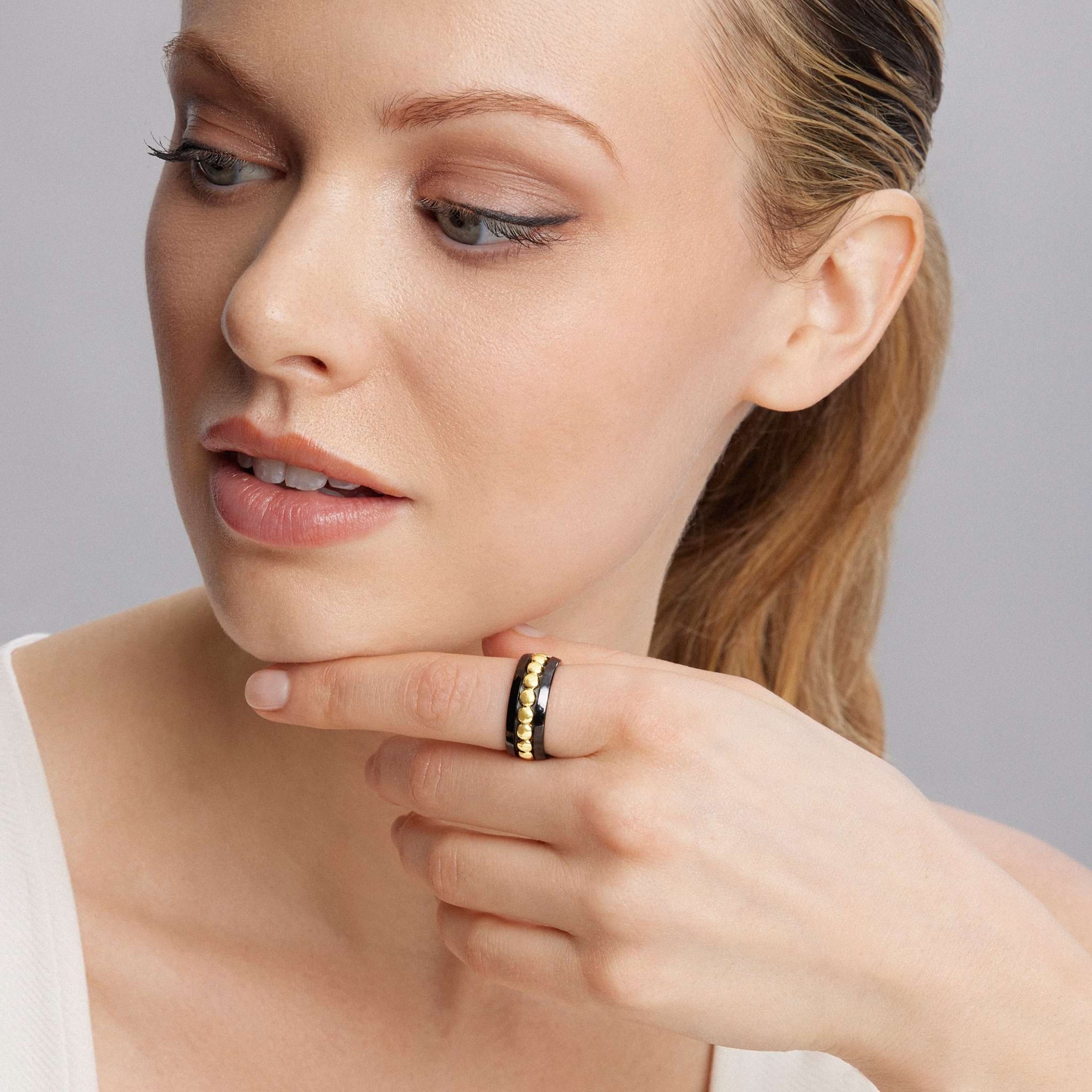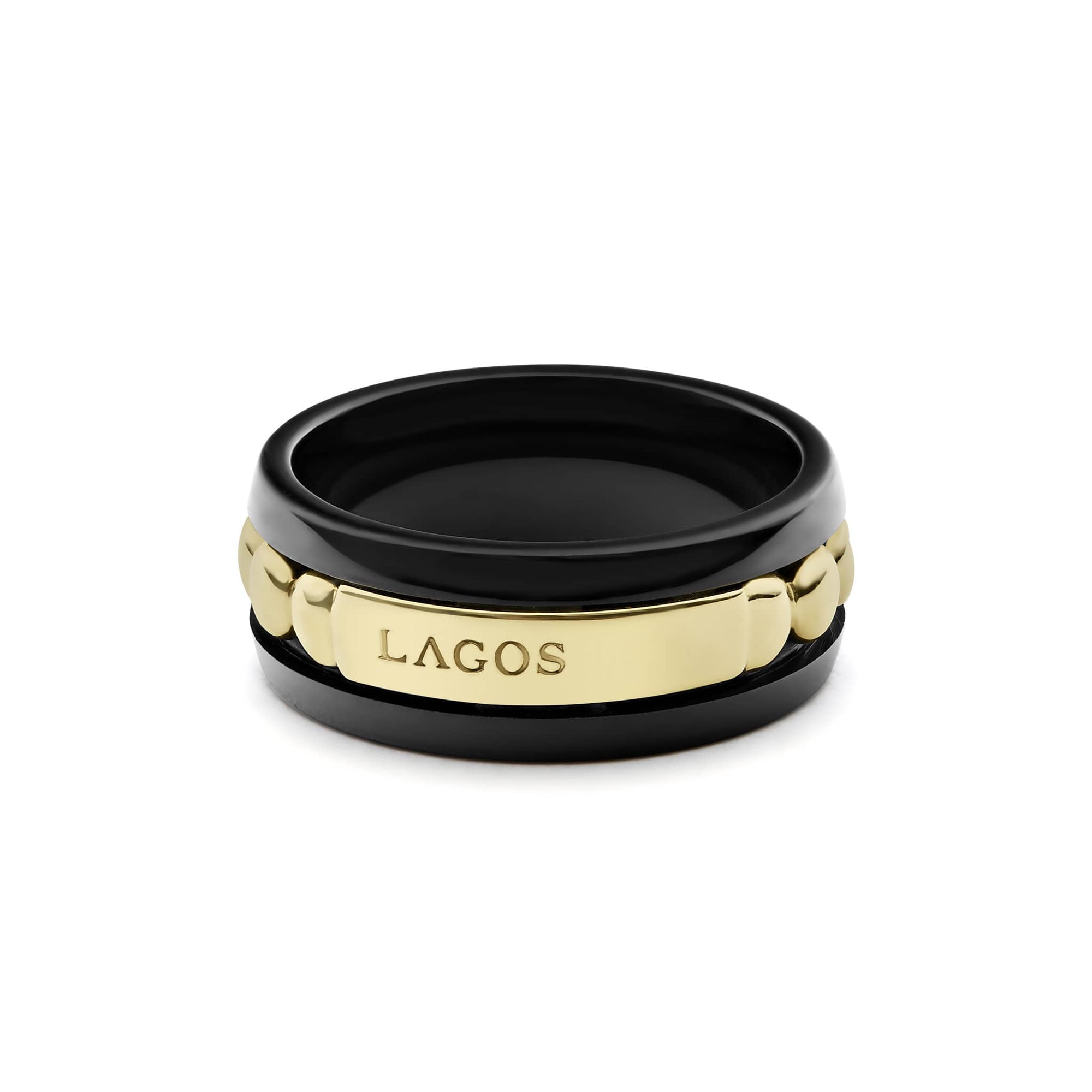 18K gold Caviar ring with black ceramic detailing the LAGOS logo forms this band.