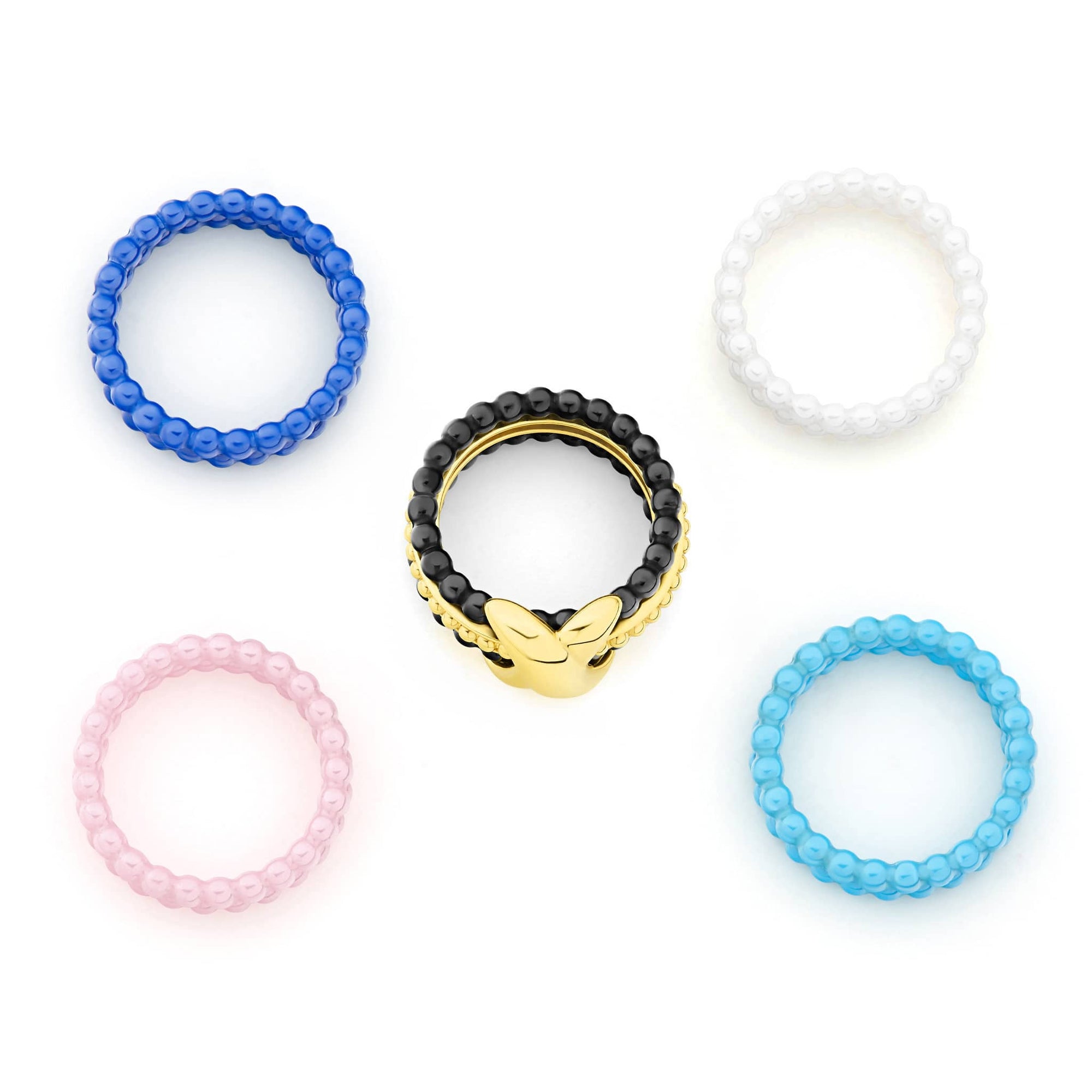 Three stacking rings form this set with two ceramic beaded bands and an 18K gold X-motif center band with Caviar beading. Five sets of ceramic bands are included - Black, White, Blue, Dark Blue, Pink - to mix and match.