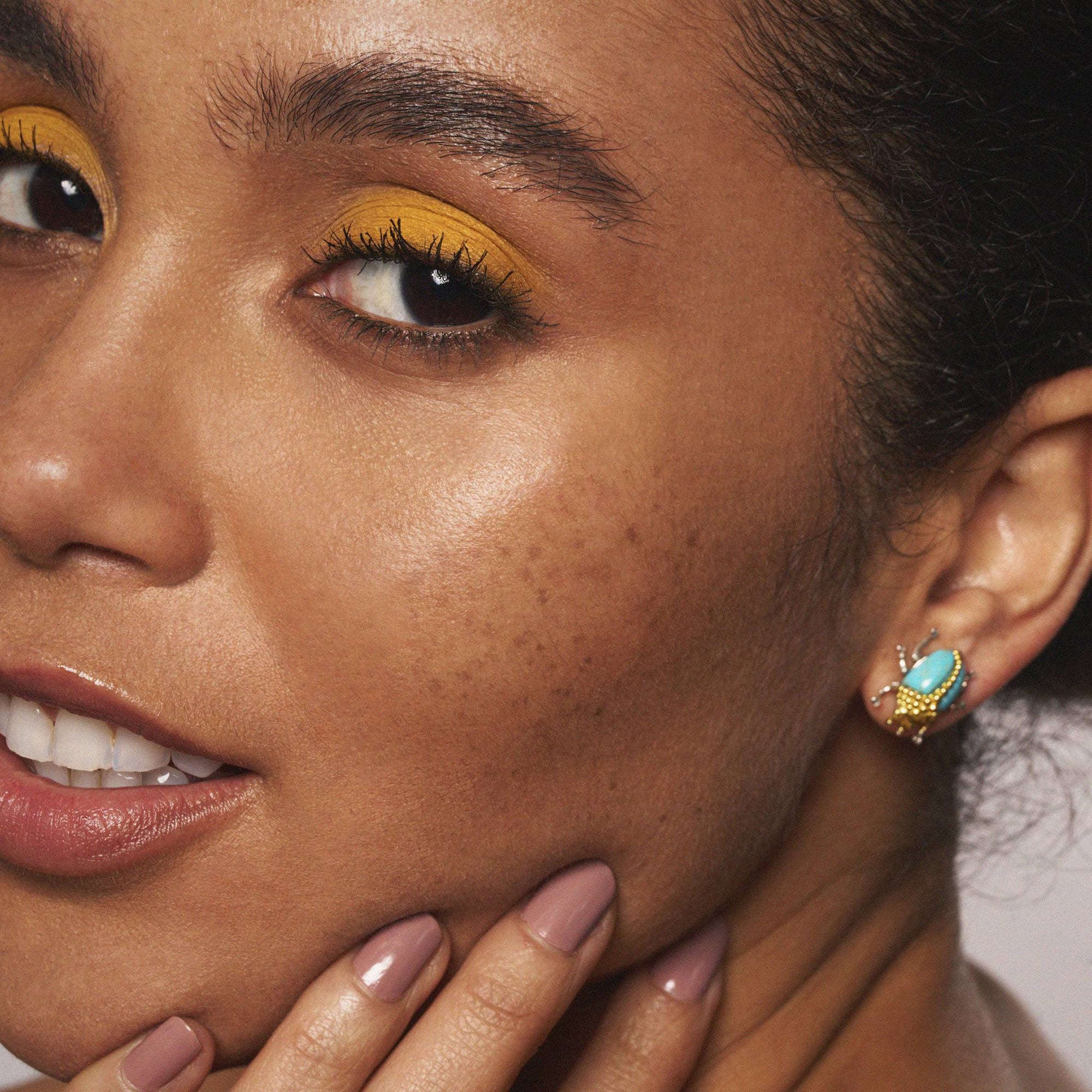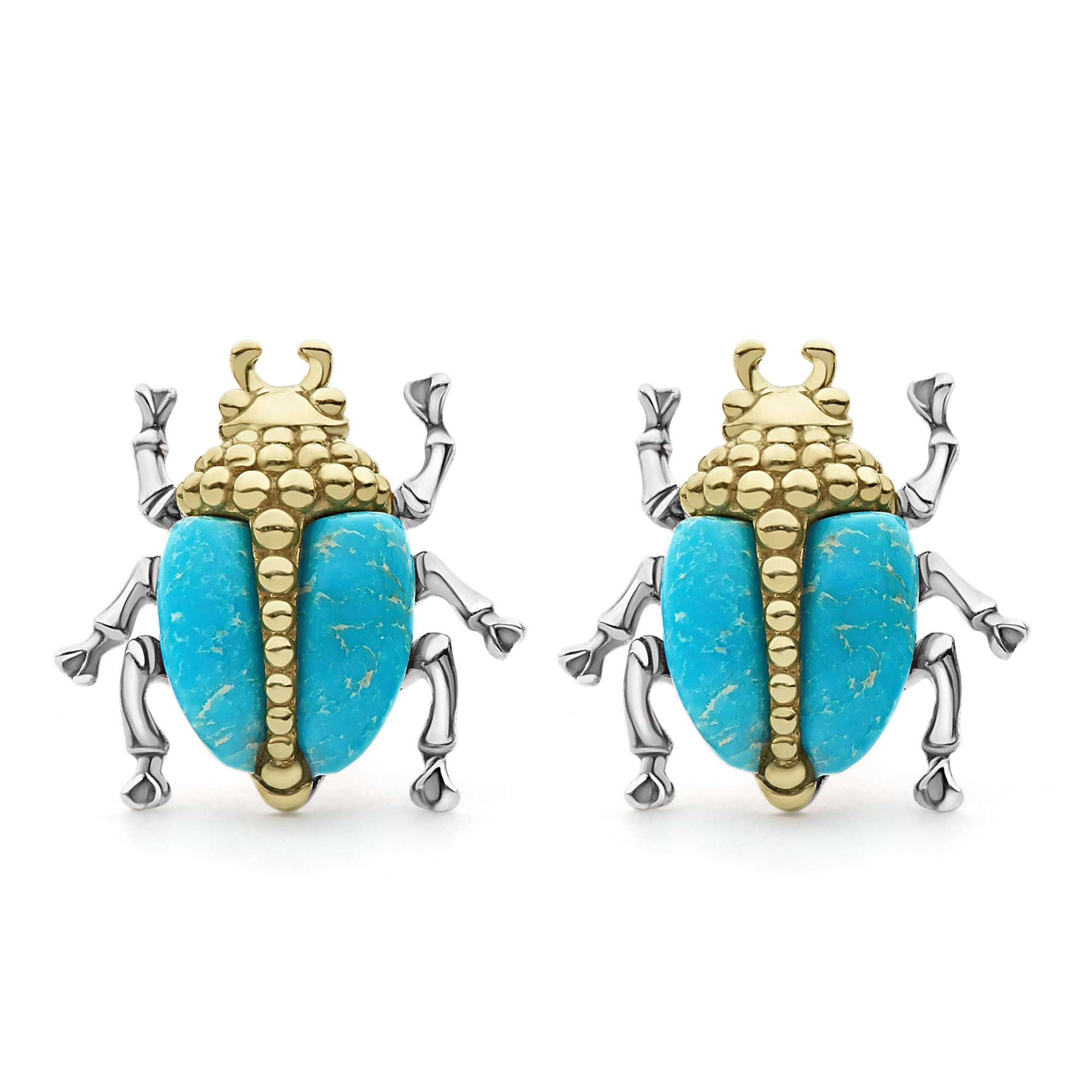 A LAGOS exclusive. Turquoise with 18K gold and sterling silver accents forming these beetle stud earrings.