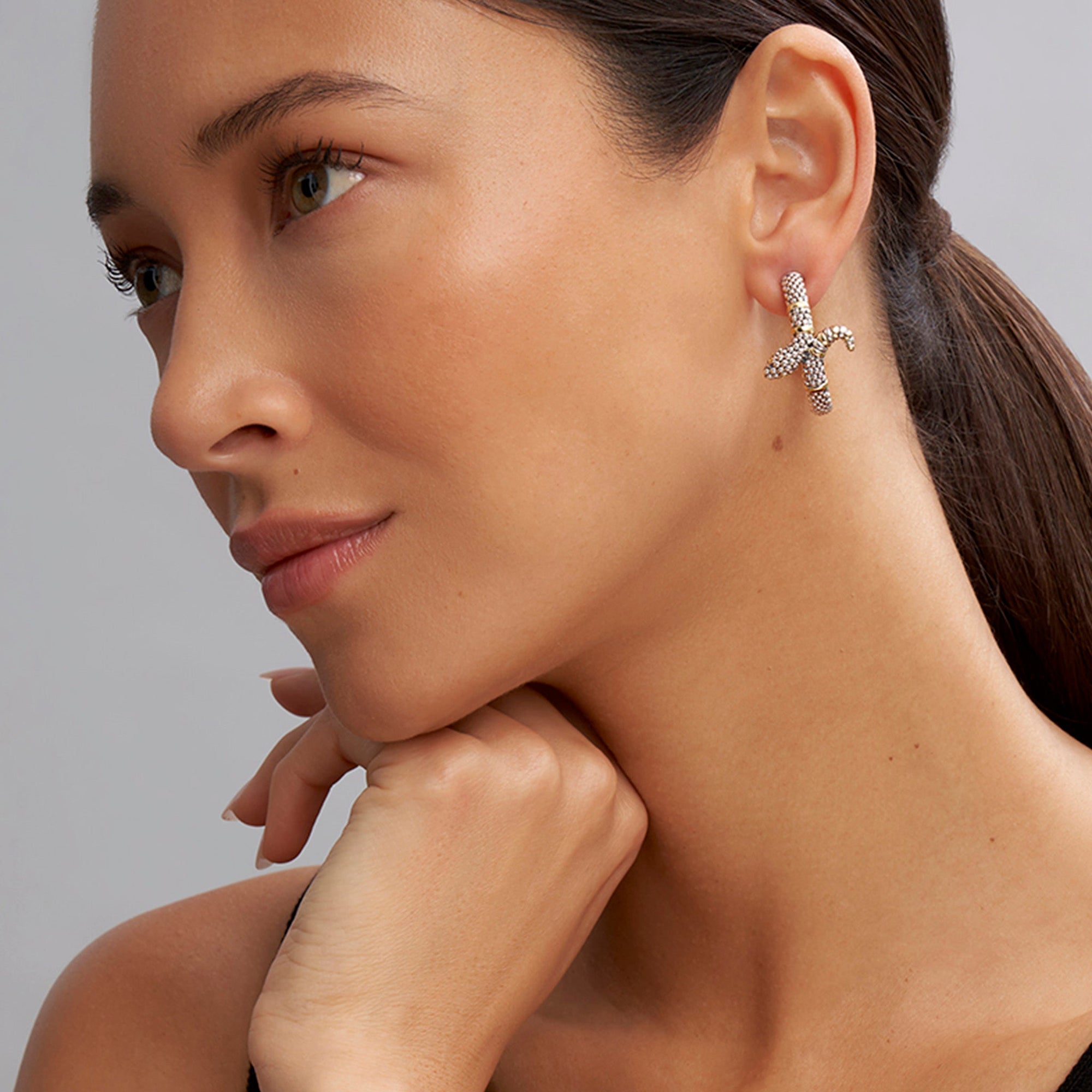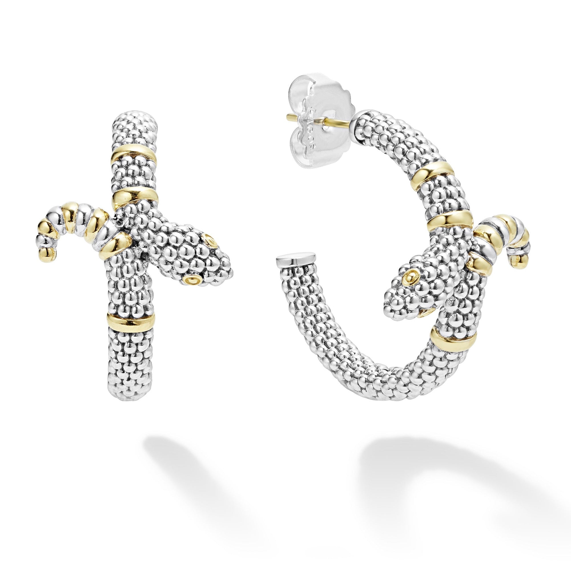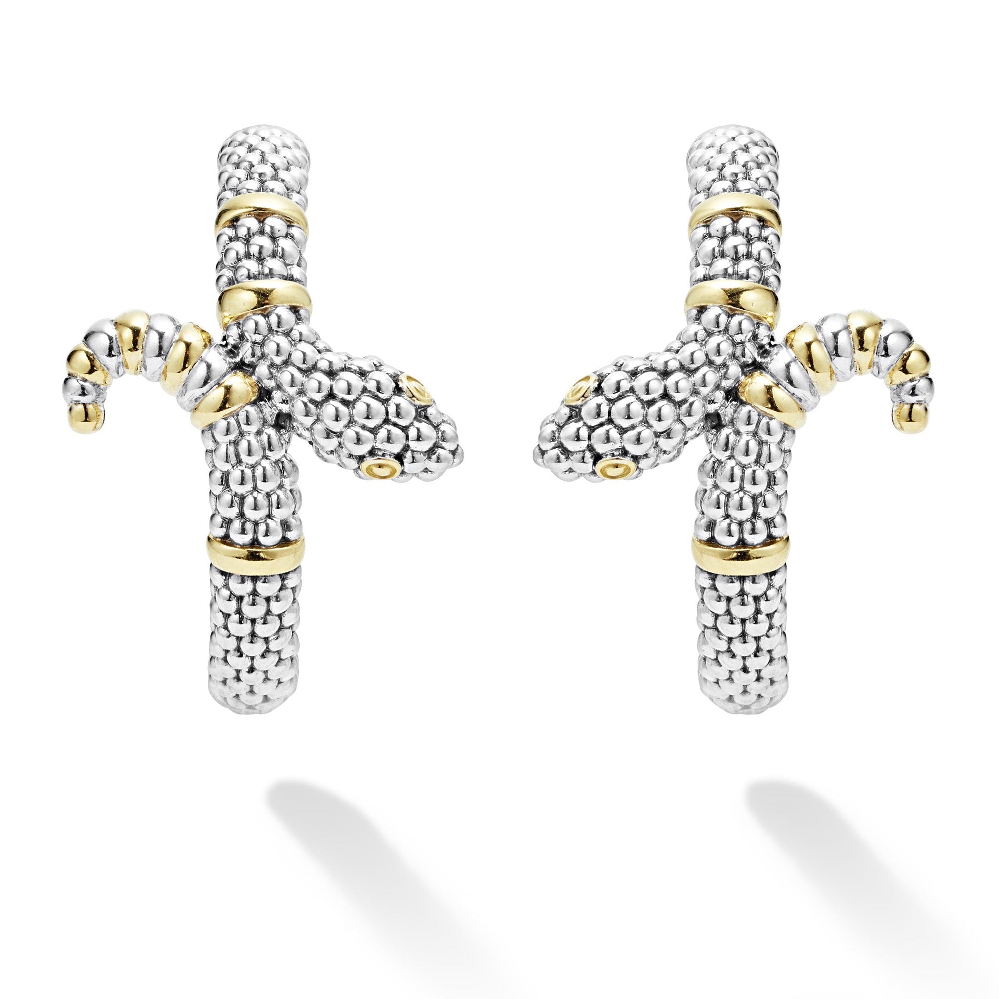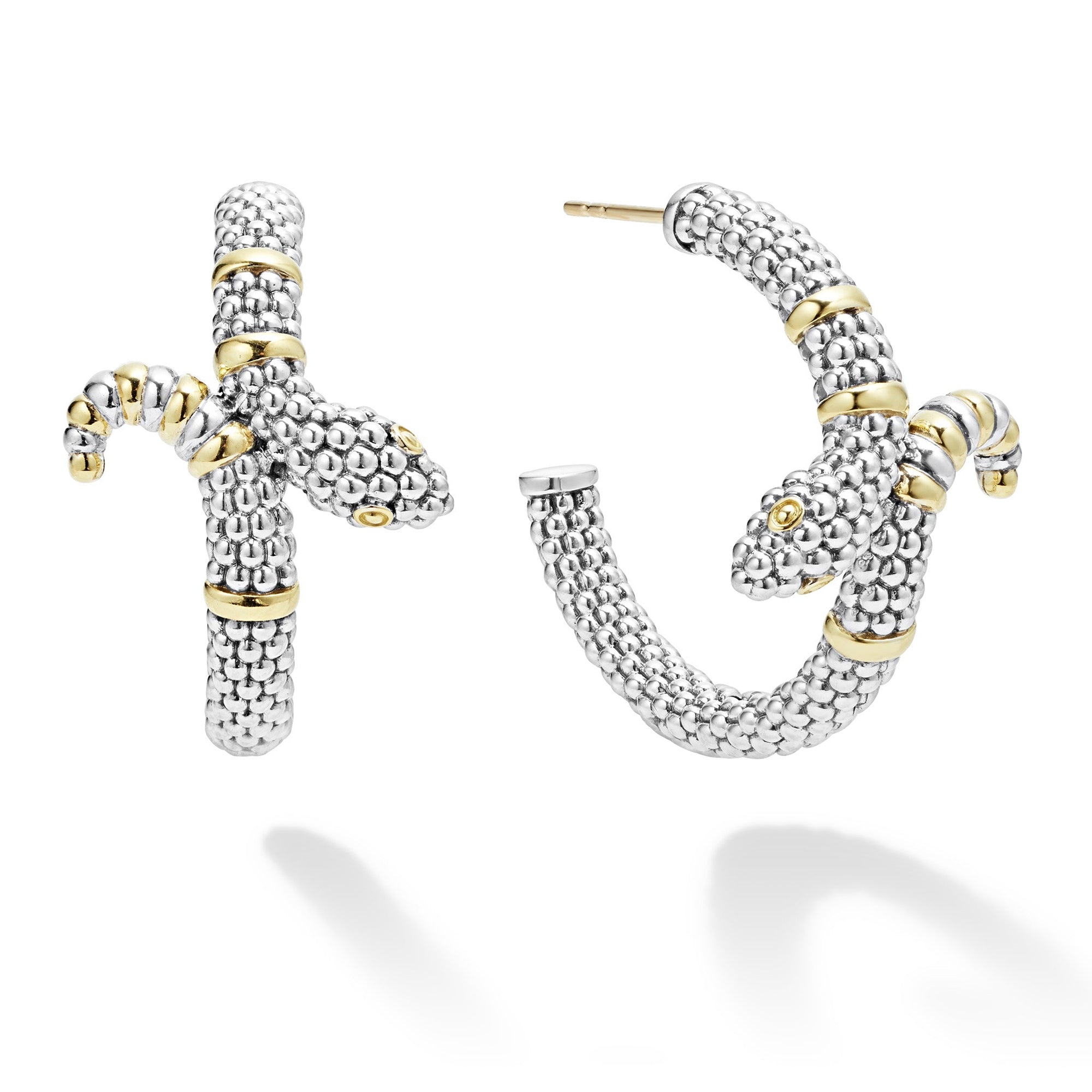 Sterling silver Caviar beading highlighted by 18K gold stations form these unique snake hoop earrings.