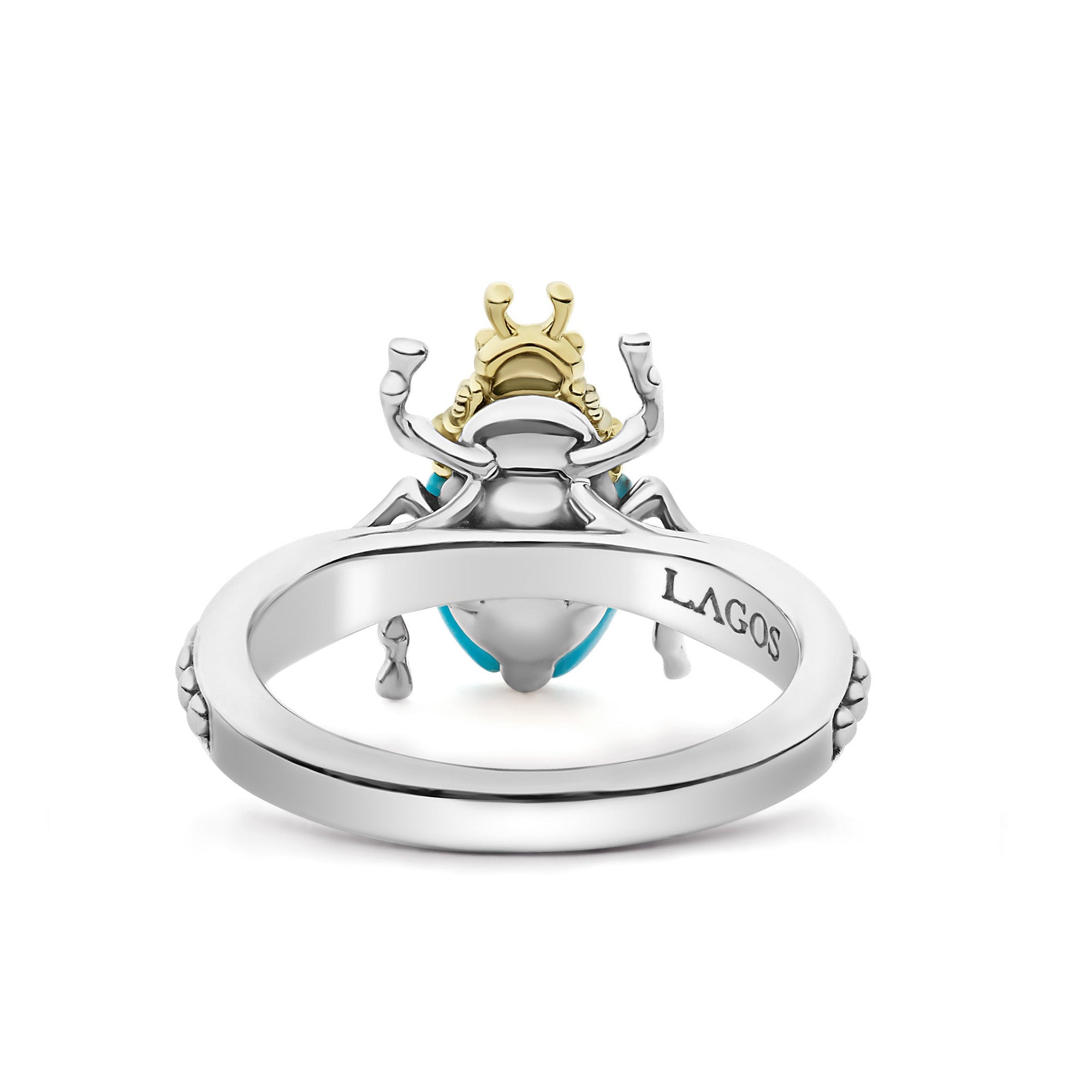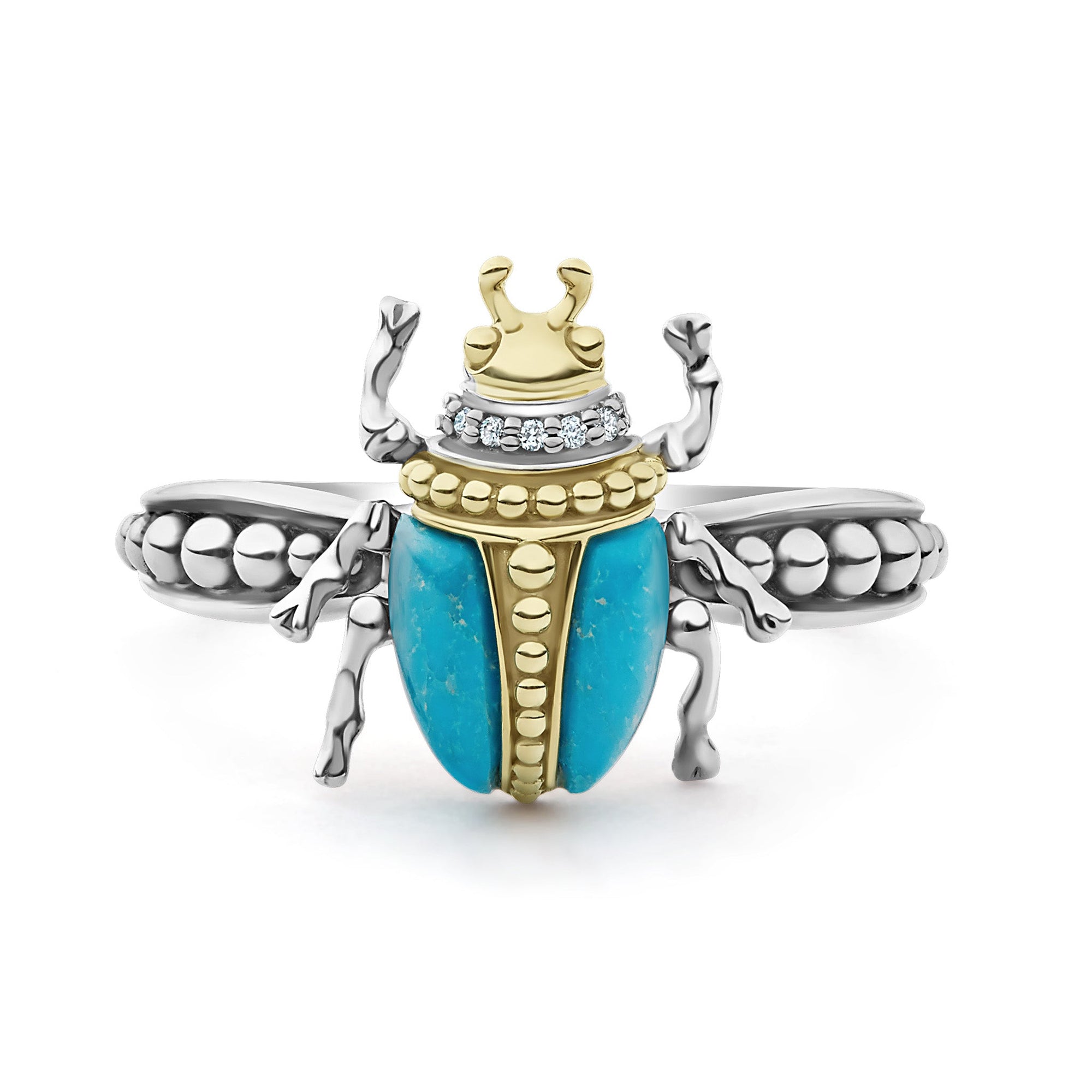 A LAGOS exclusive. Turquoise with diamond, 18K gold and sterling silver accents forming a beetle ring. Ideal to pair with other signature Rare Wonder designs.