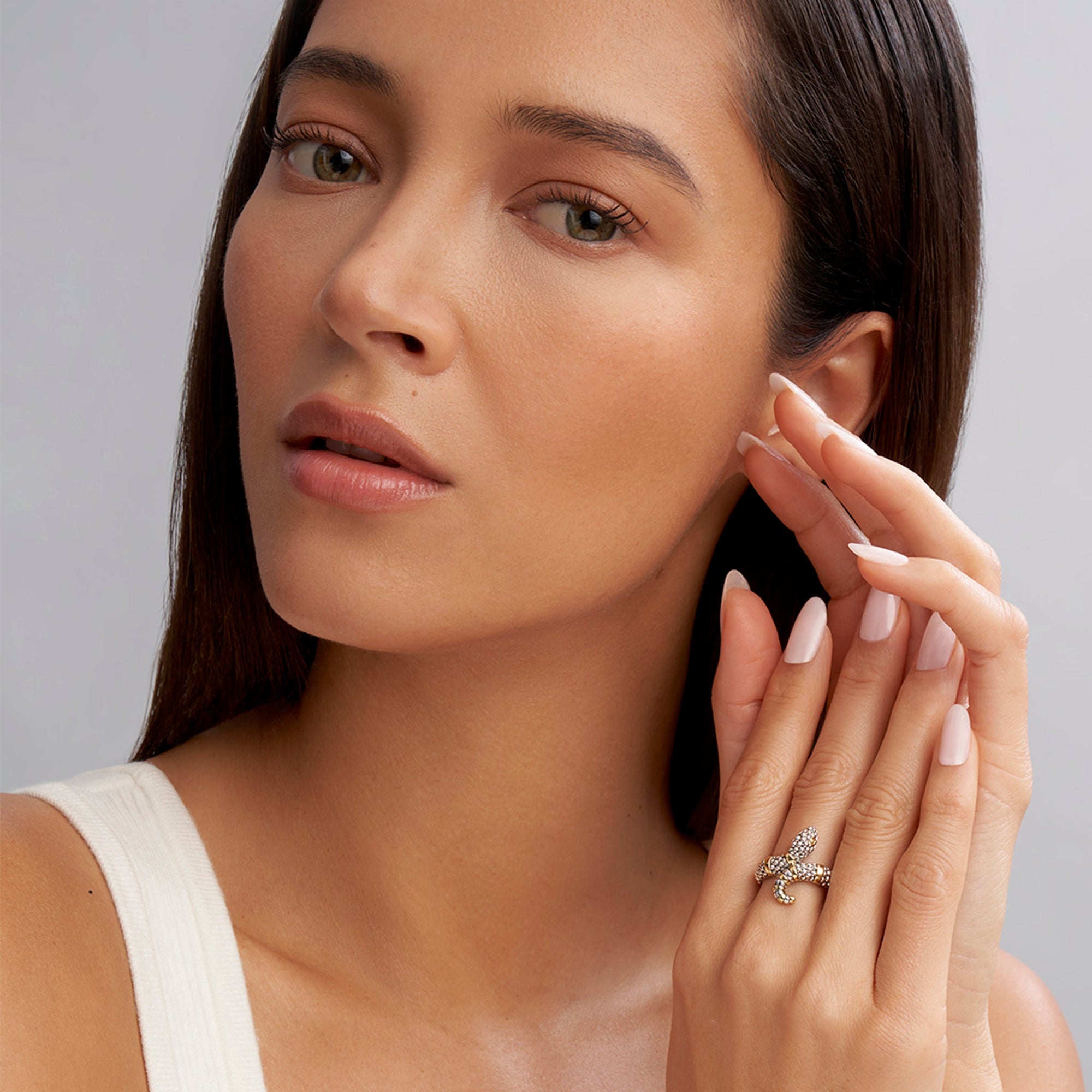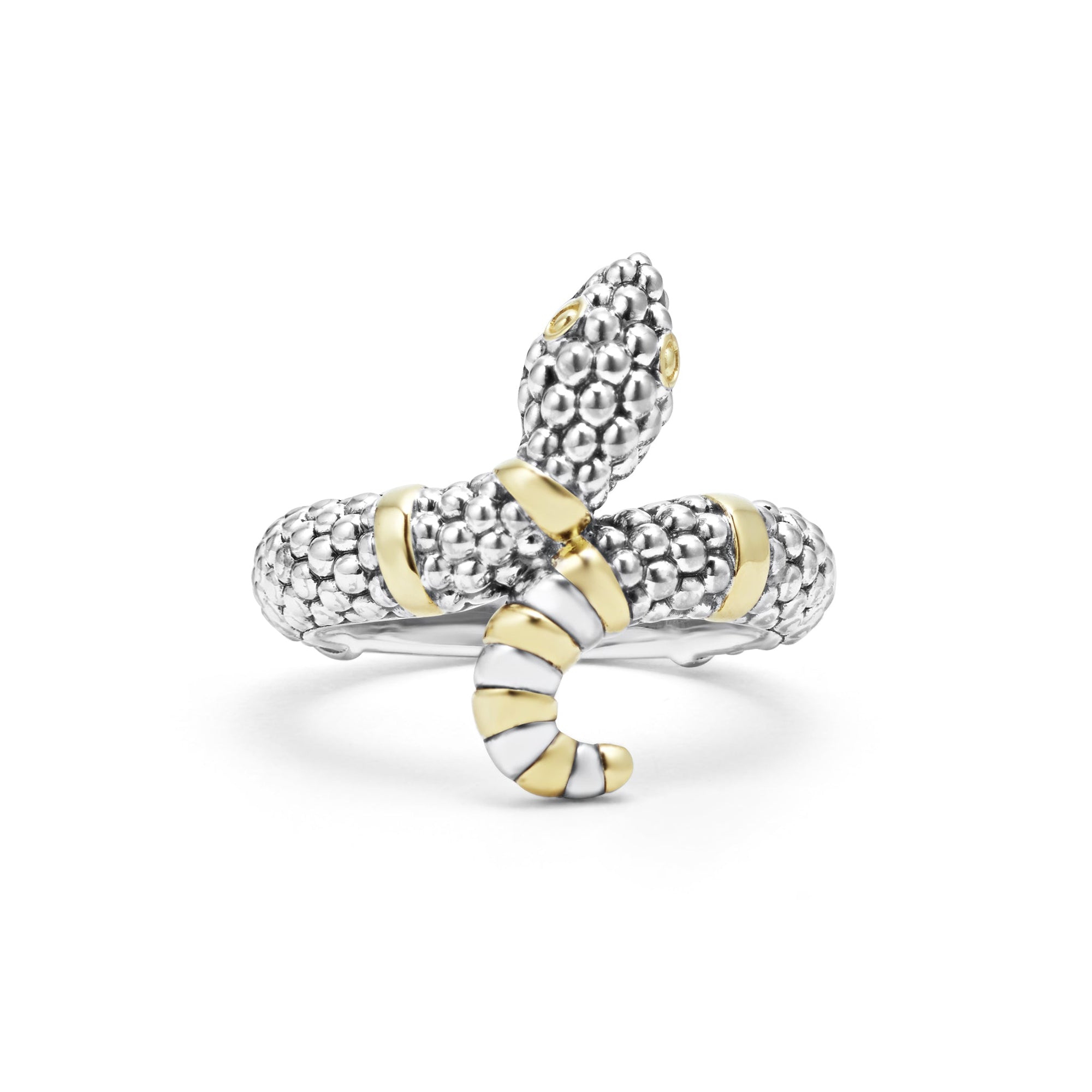 Sterling silver Caviar beading highlighted by 18K gold stations form this unique snake ring.