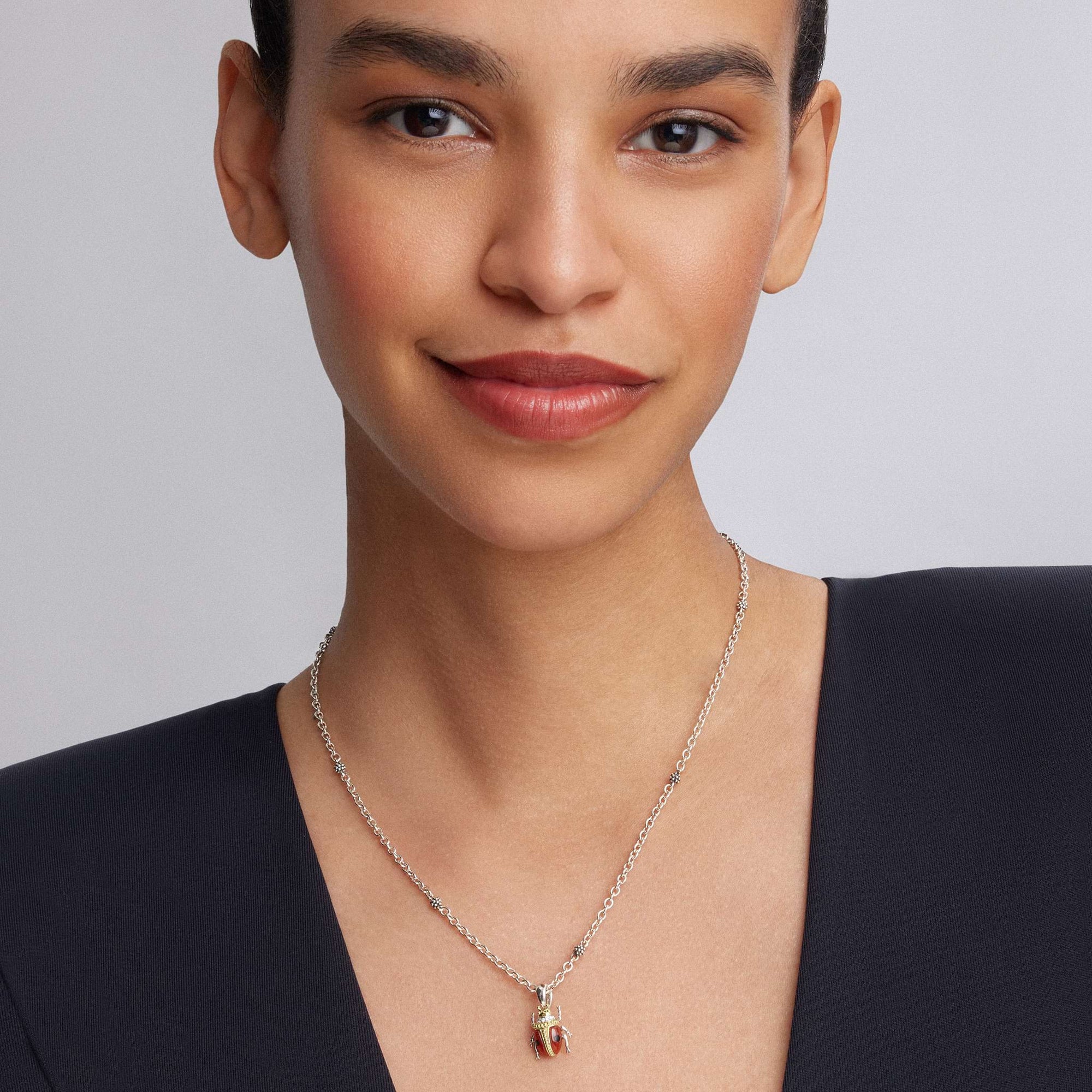A LAGOS exclusive. Red agate with diamond, 18K gold and sterling silver accents forming a beetle pendant. Ideal to pair with other signature Rare Wonder designs.