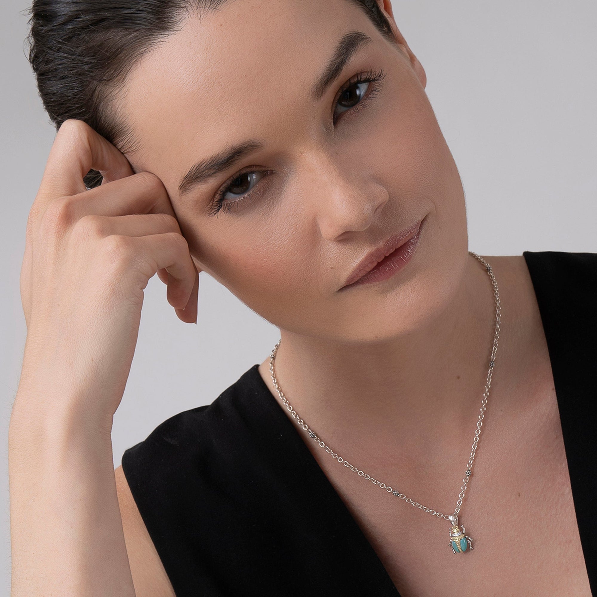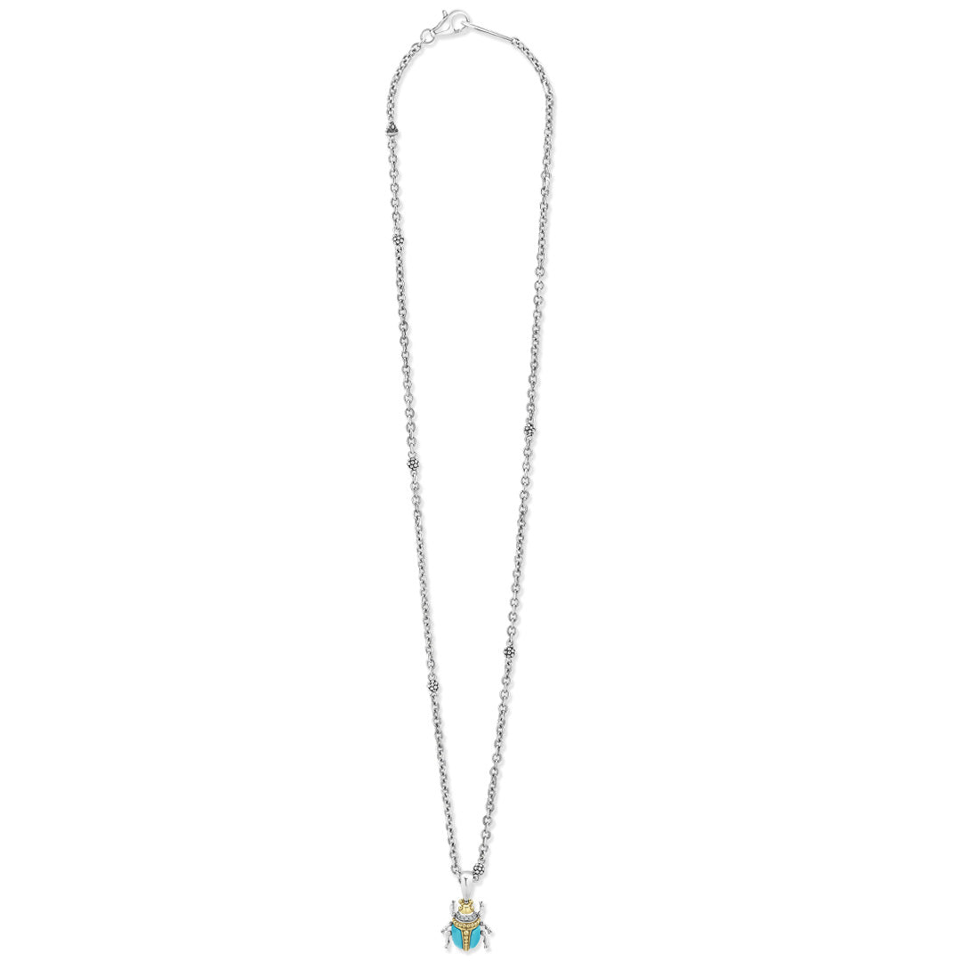 A LAGOS exclusive. Turquoise with diamond, 18K gold and sterling silver accents forming a beetle pendant.