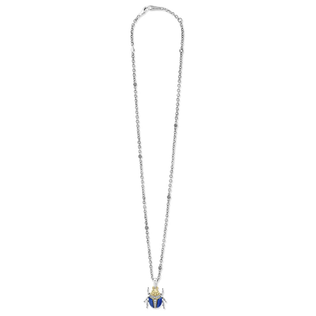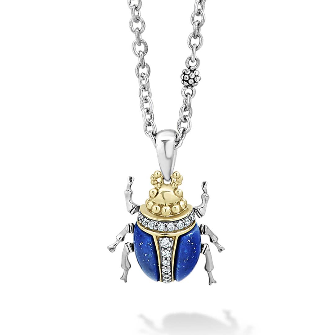 A LAGOS exclusive. Lapis with diamond, 18K gold and sterling silver accents forming a beetle pendant finished on a versatile link necklace with six sterling silver Caviar beaded stations.