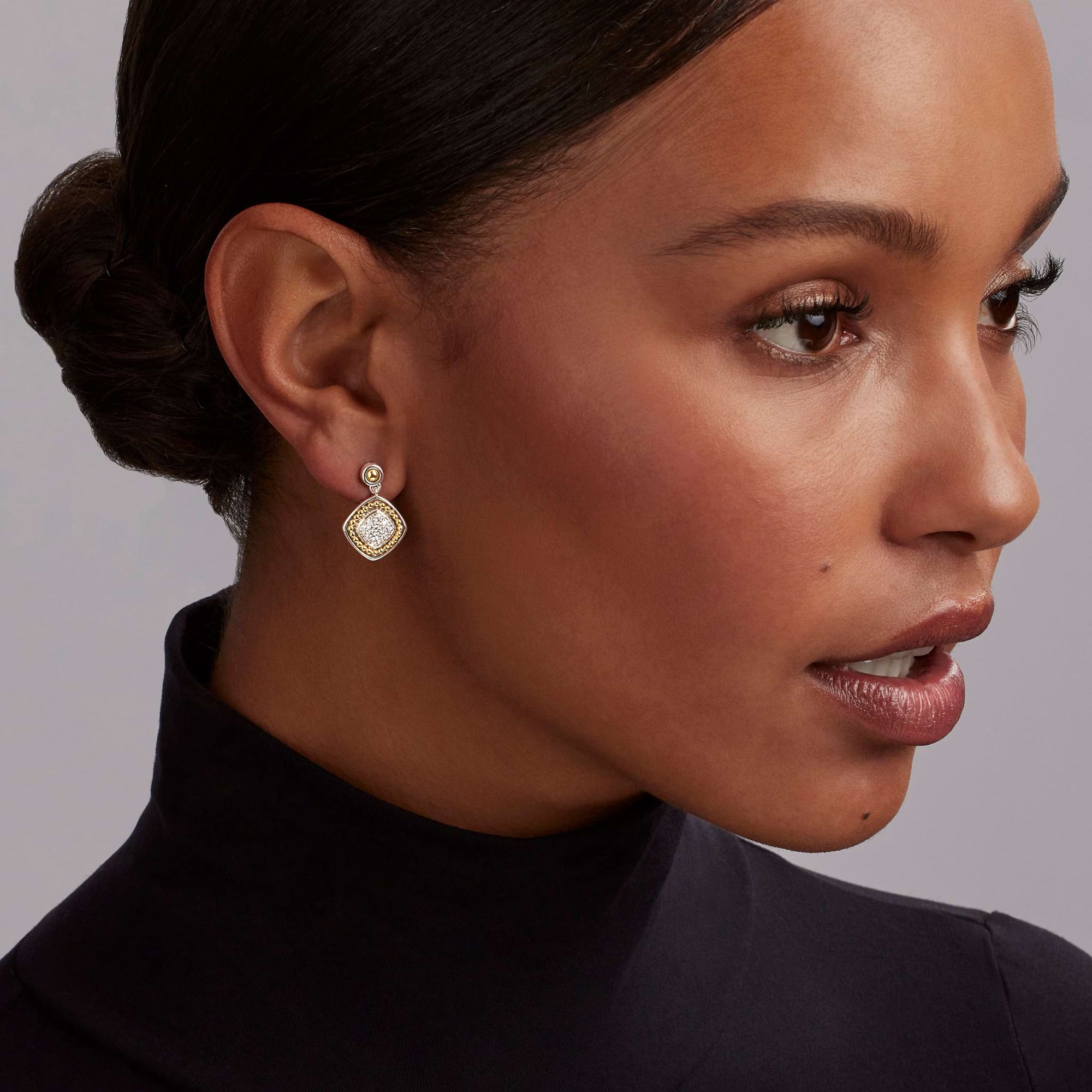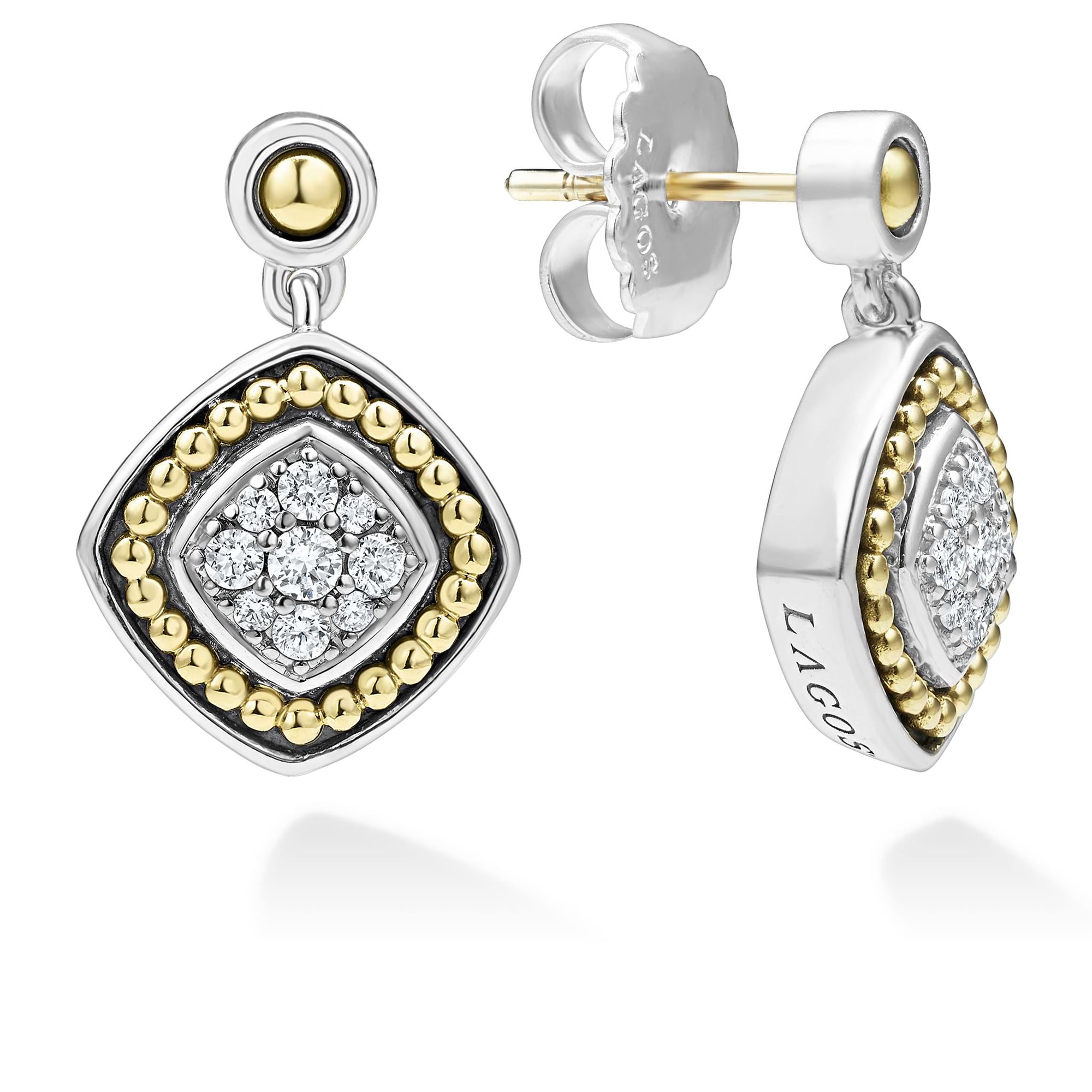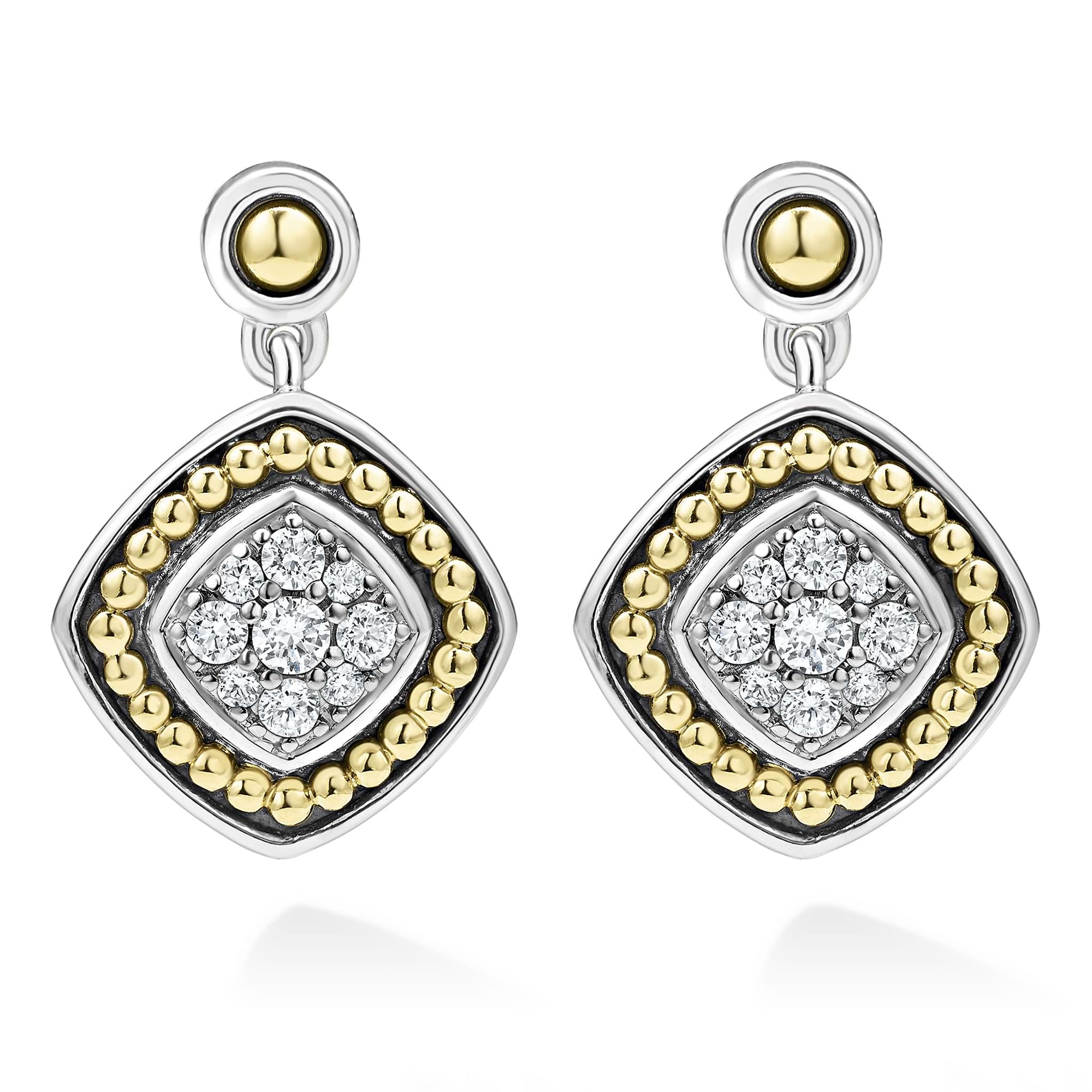 A LAGOS exclusive. Diamond surrounded by sterling silver and 18K gold Caviar beading form these drop earrings. LAGOS diamonds are the highest quality natural stones.