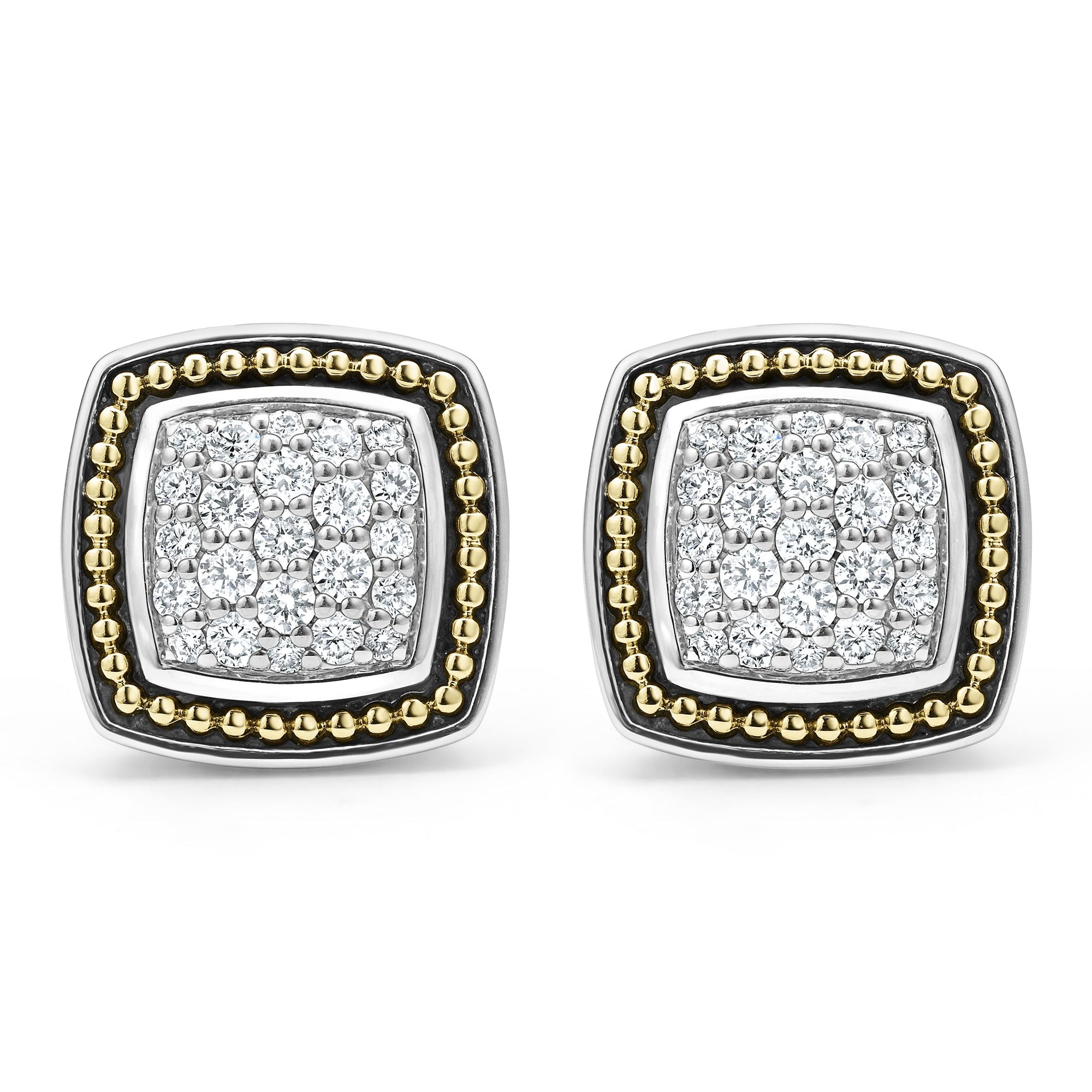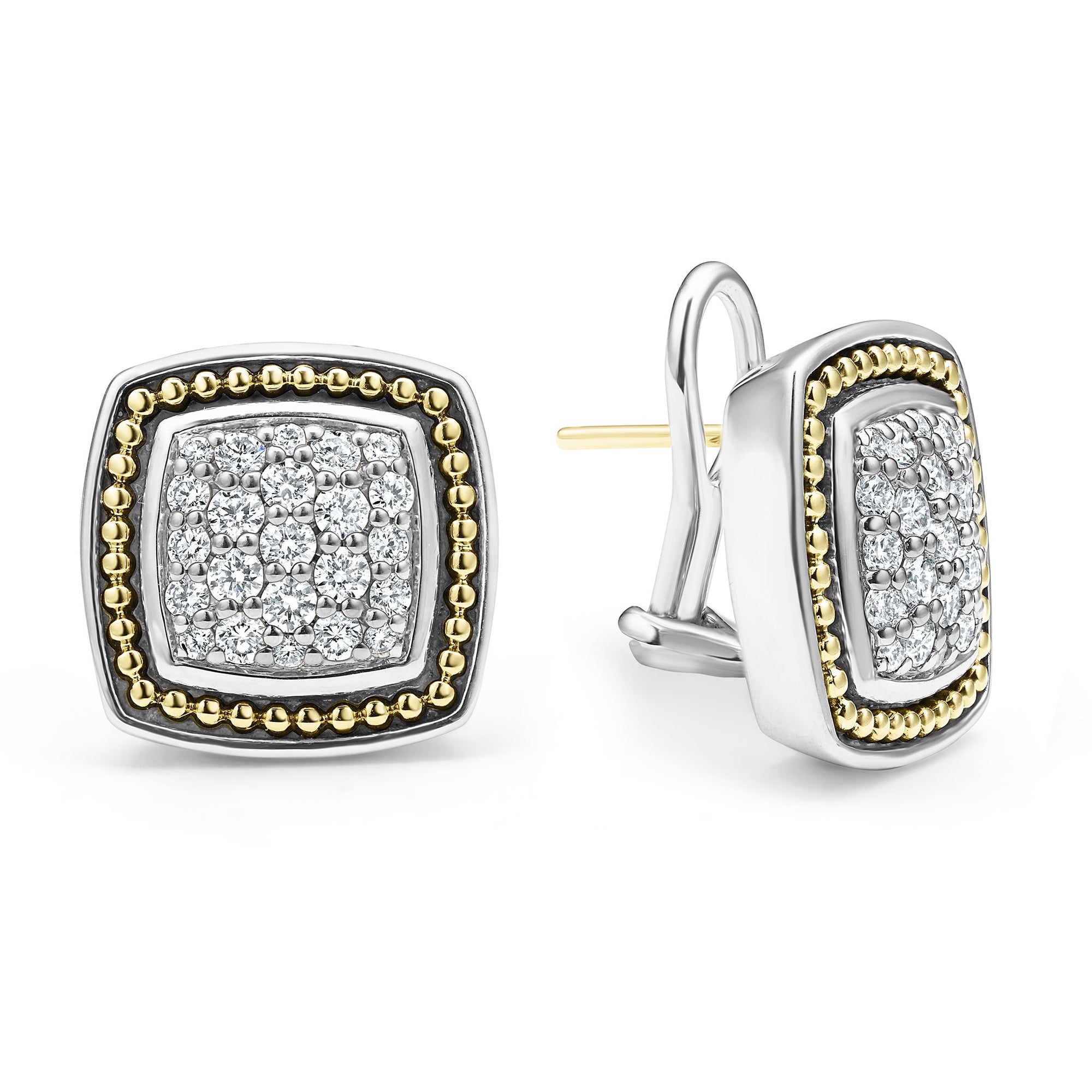 A LAGOS exclusive. Diamond omega clip earrings surrounded by 18K gold Caviar beading and smooth sterling silver. LAGOS diamonds are the highest quality natural stones.