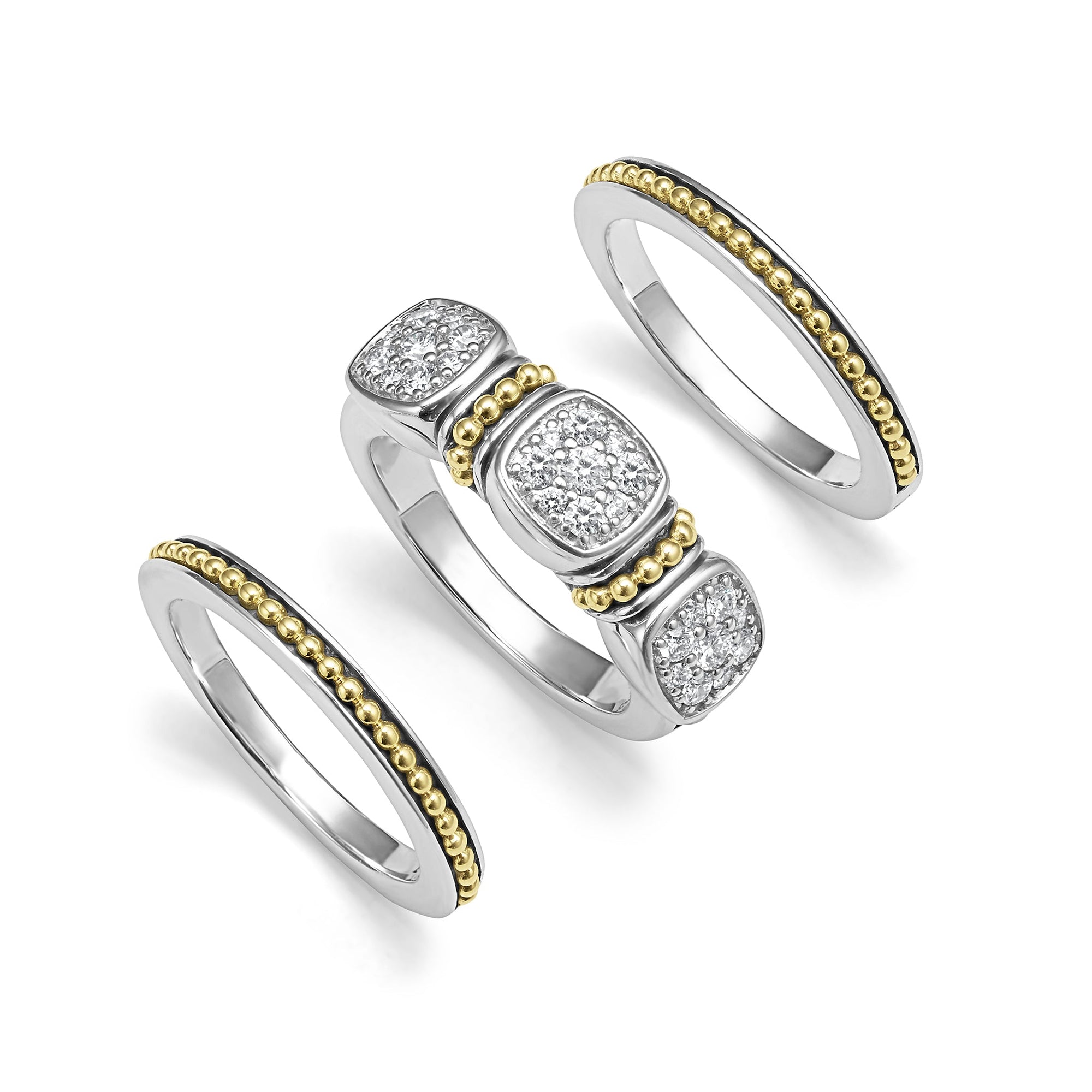 A LAGOS exclusive. A trio of stacking rings with one diamond ring and two 18K gold Caviar beaded rings with sterling silver accents.