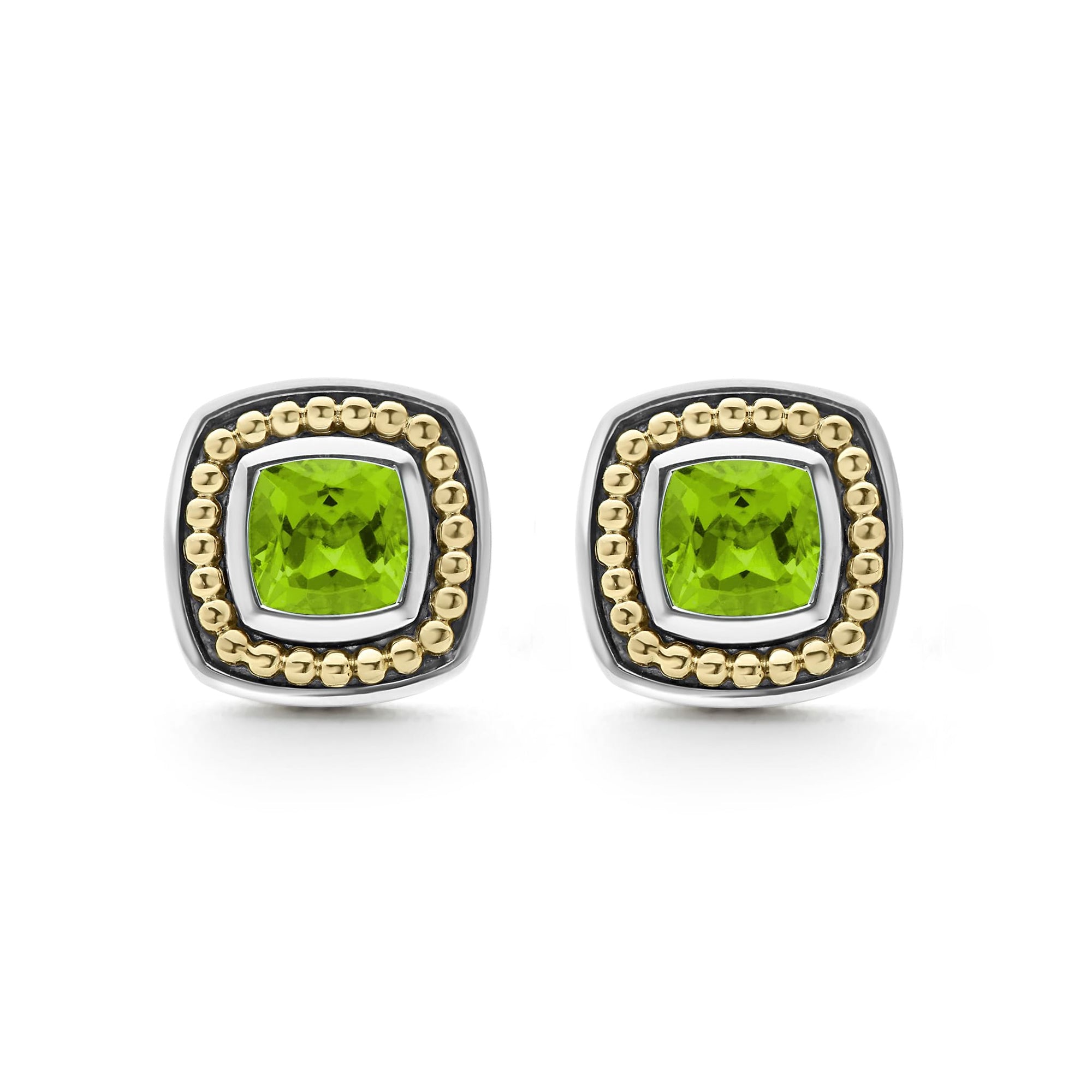 Peridot gemstone stud earrings surrounded by sterling silver and 18K gold Caviar beading.