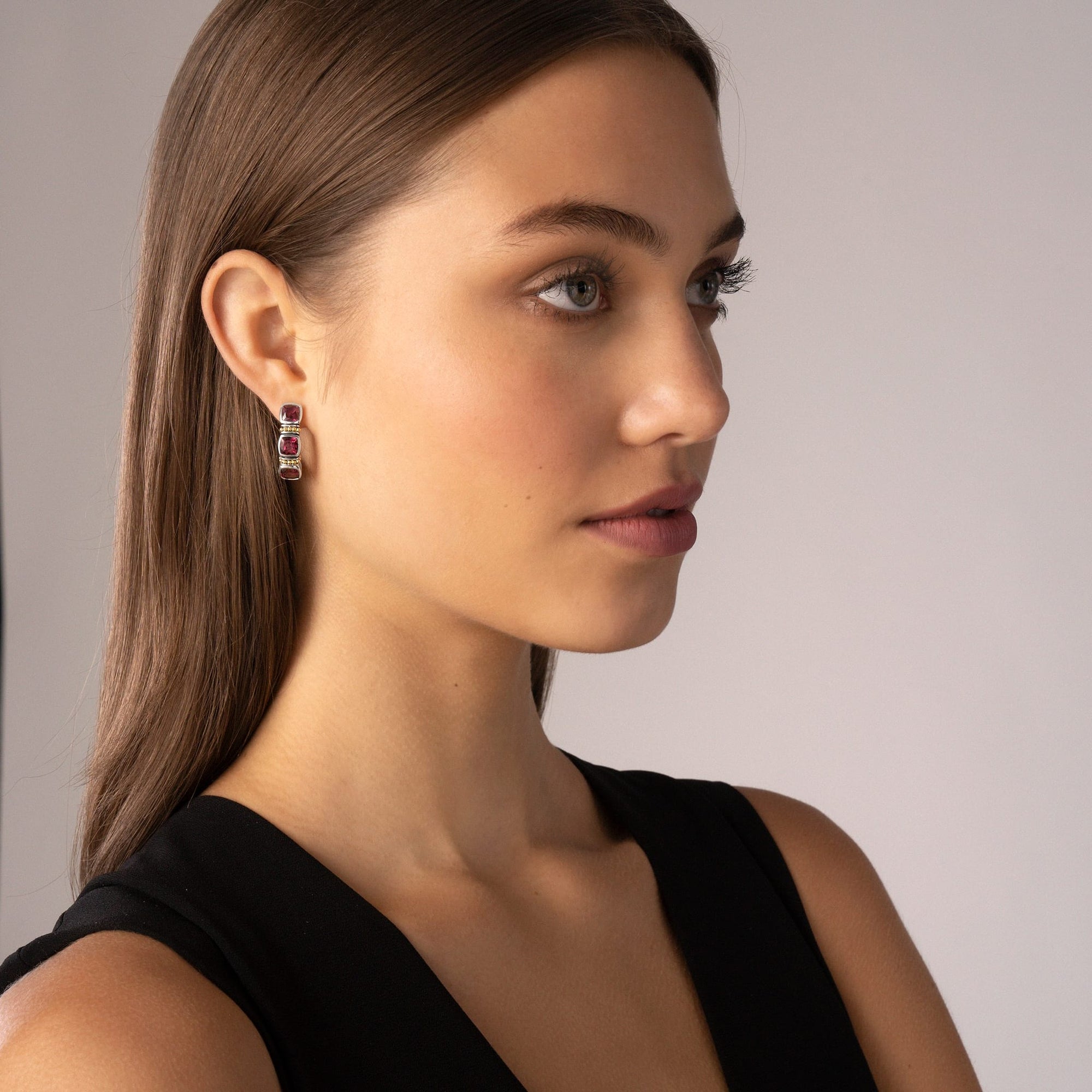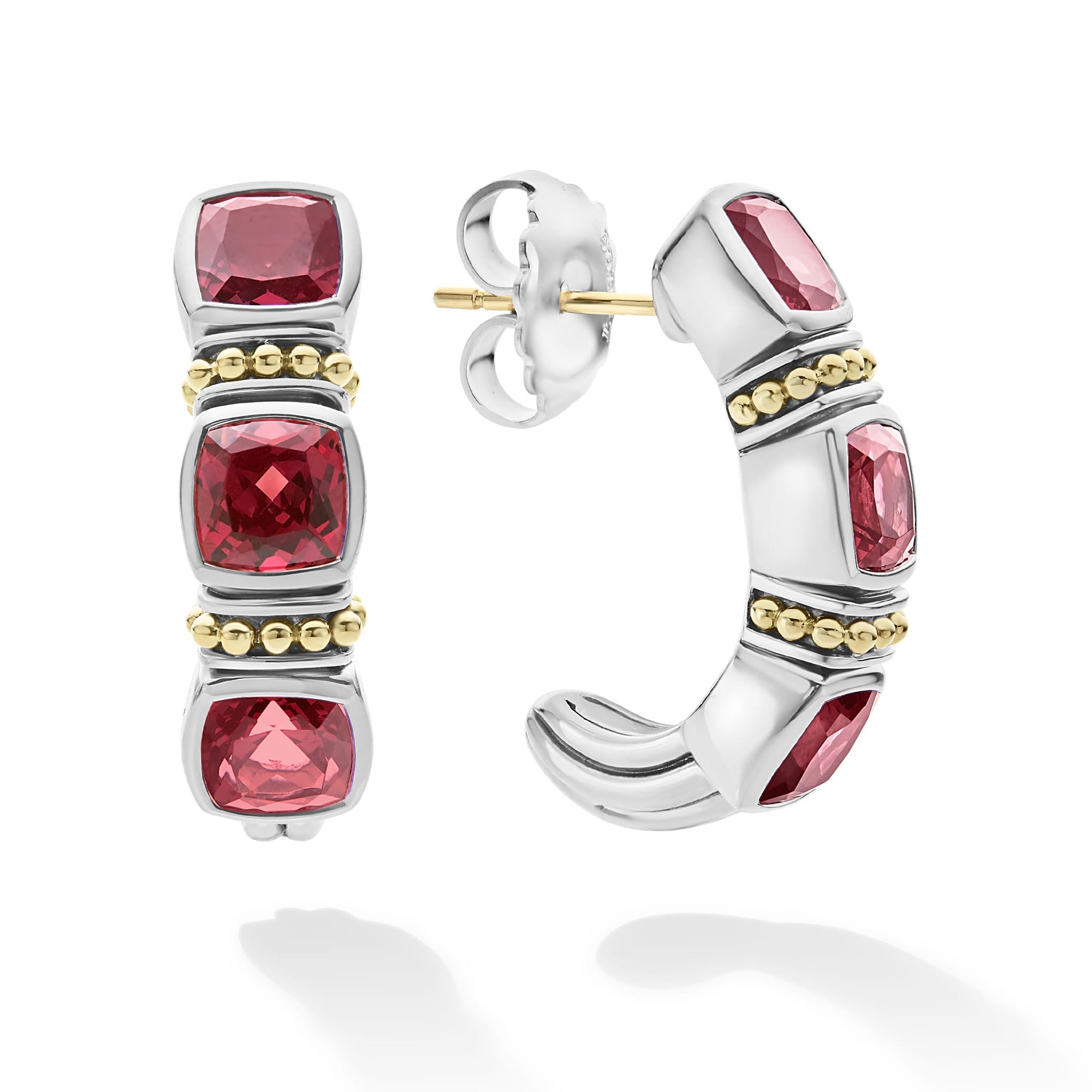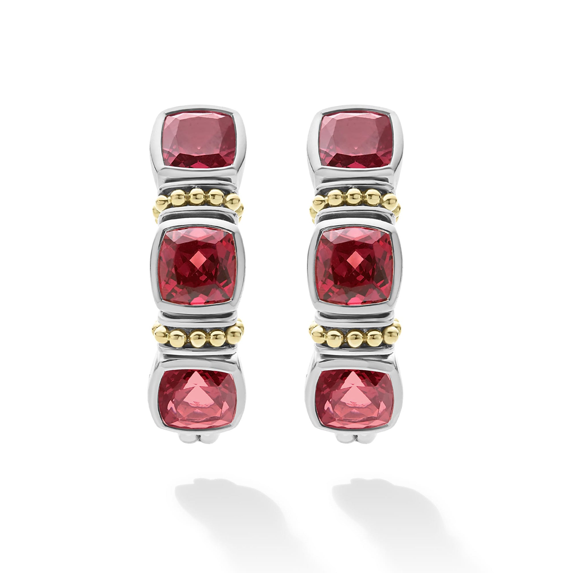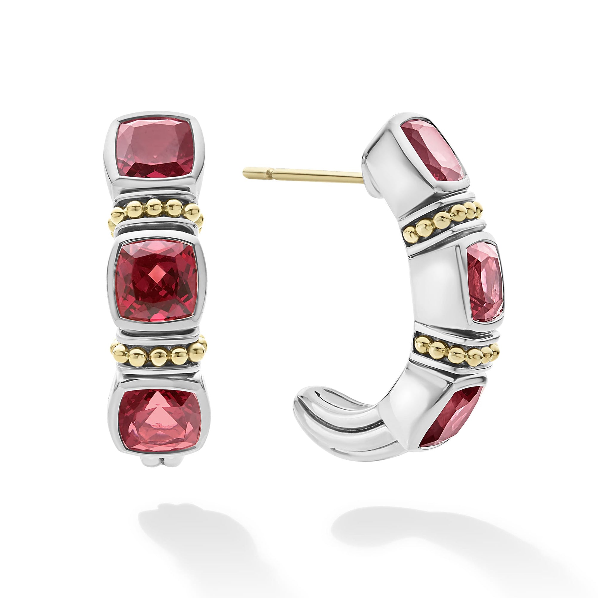 Rhodolite garnet gemstone hoop earrings surrounded by sterling silver and 18K gold Caviar beading.