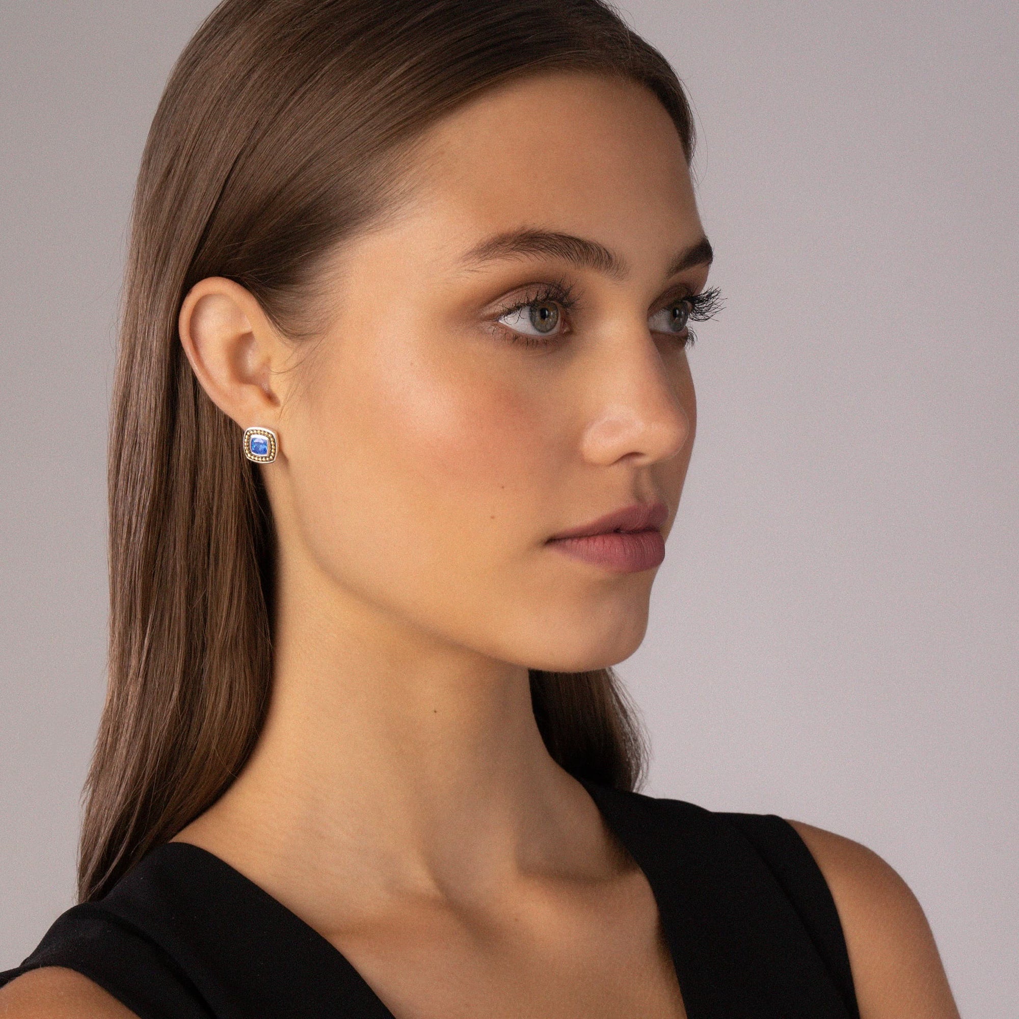 Swiss blue topaz gemstone stud earrings surrounded by sterling silver and 18K gold Caviar beading.