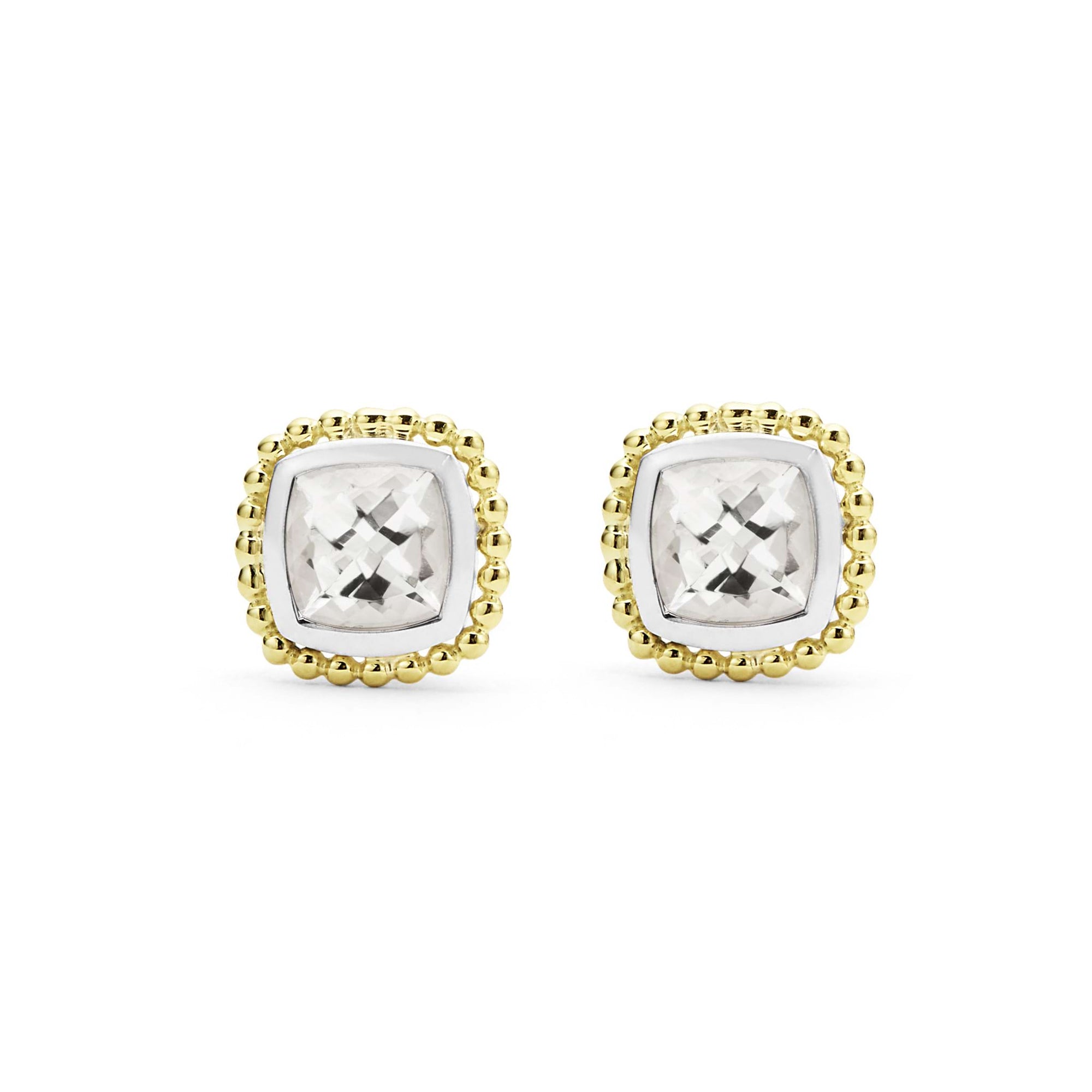 White topaz gemstone stud earrings surrounded by smooth sterling silver and 18k gold Caviar beading.