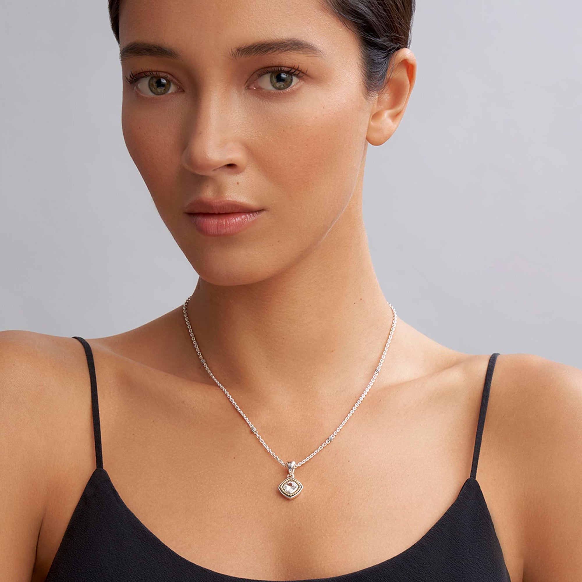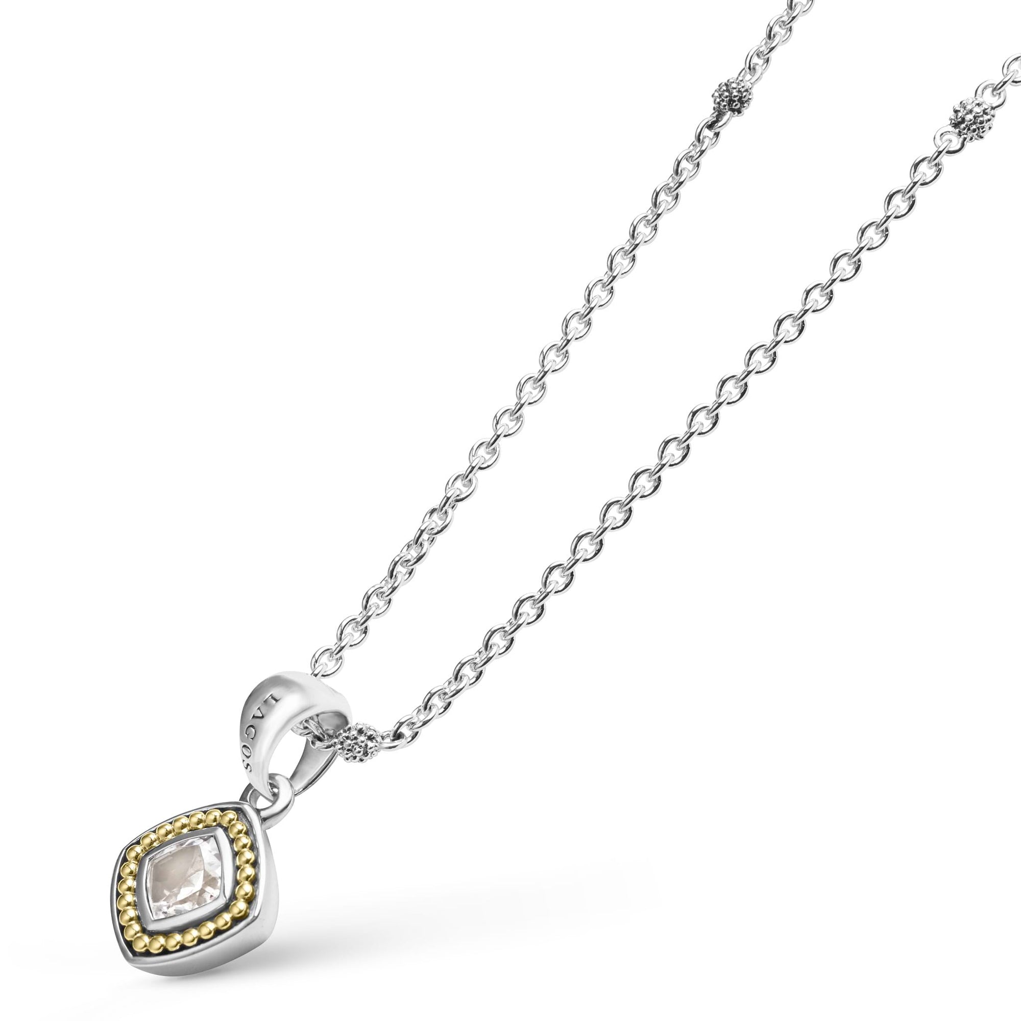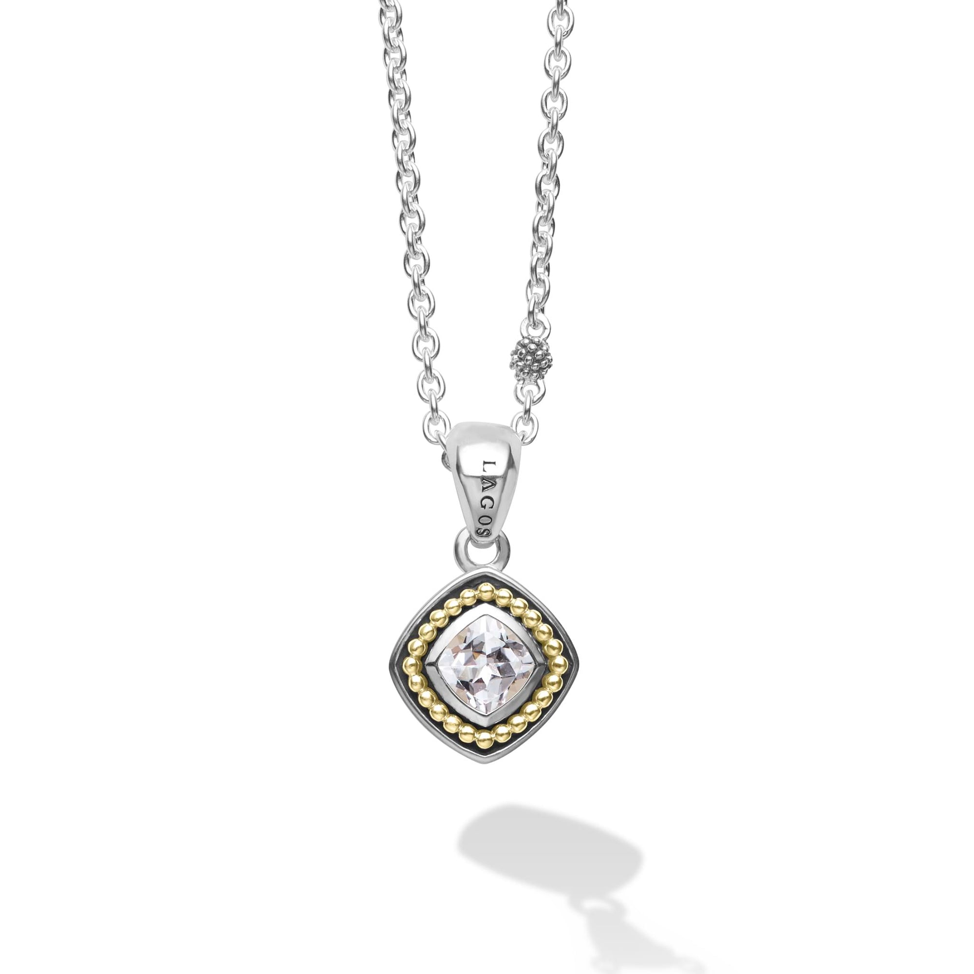 A white topaz gemstone surrounded by sterling silver and 18k gold Caviar beading form this pendant. Finished on a versatile link necklace.