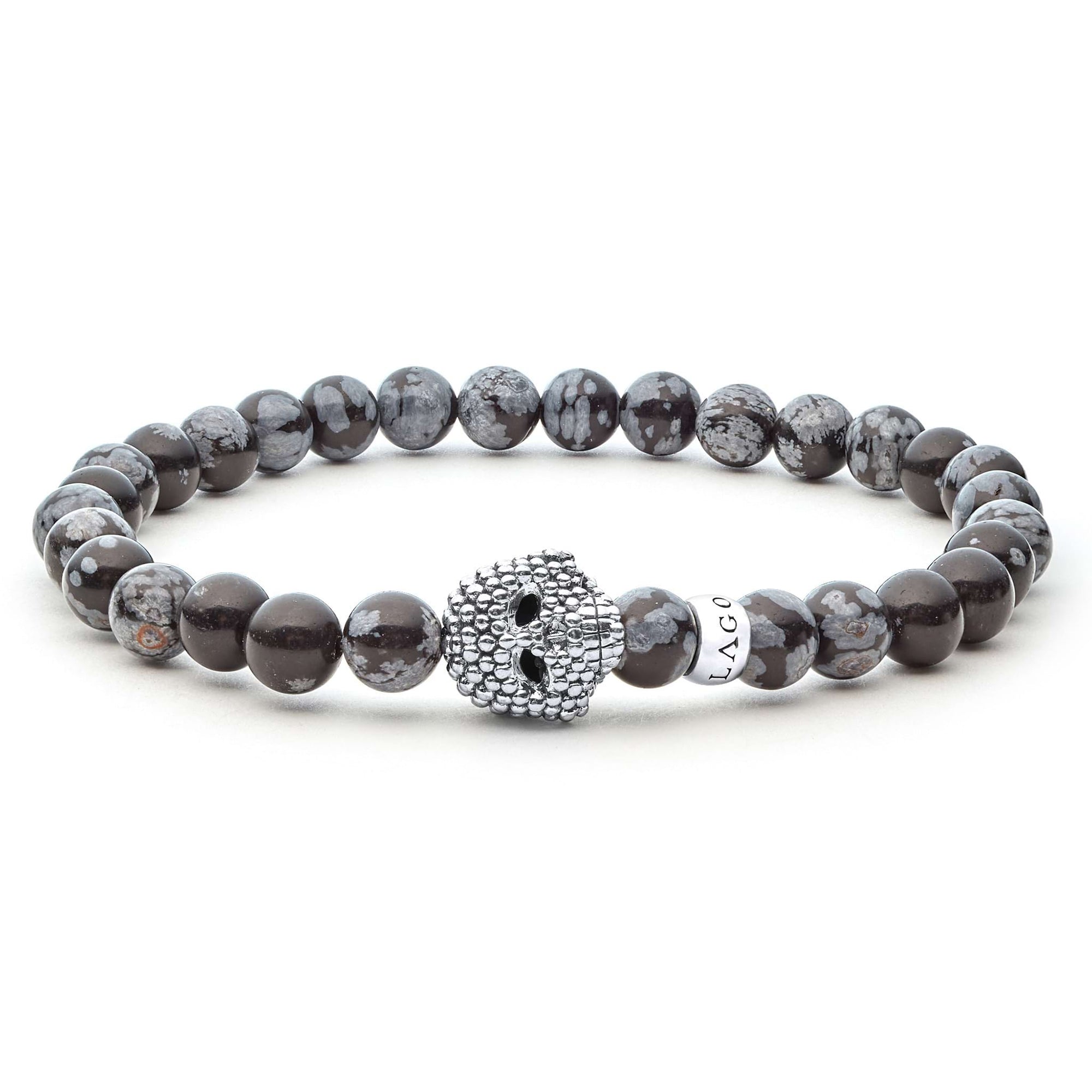 A LAGOS exclusive. Malachite, lapis, and snowflake obsidian gemstone bracelets accented by a sterling silver Caviar beaded skull.