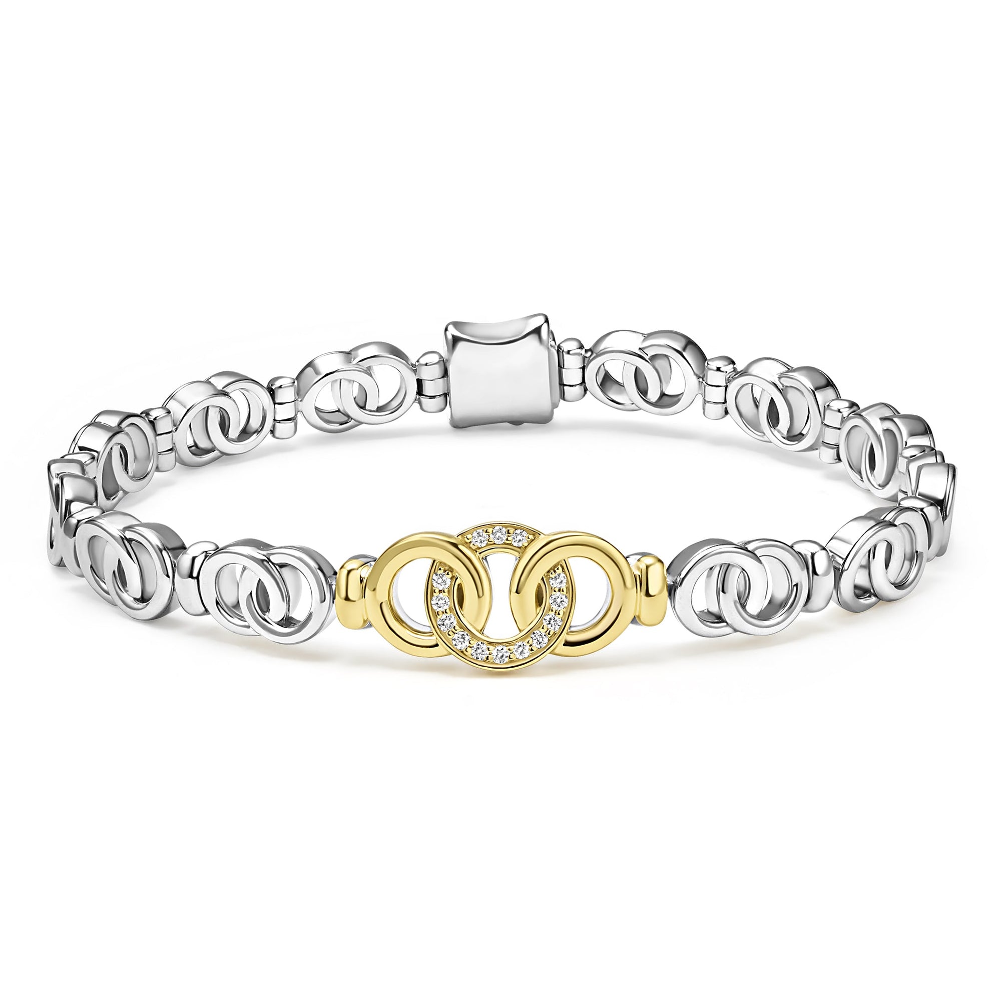 18K gold, sterling silver, and diamonds form this interlocking link bracelet. LAGOS diamonds are the highest quality natural stone.