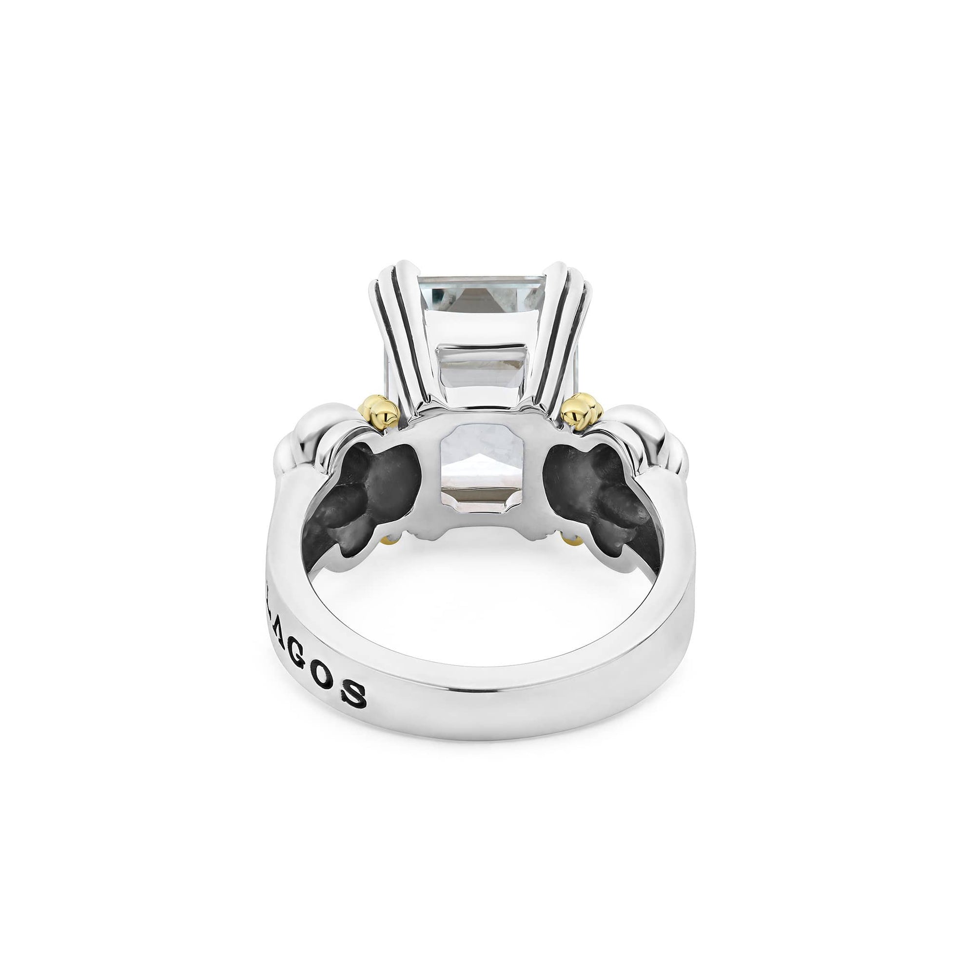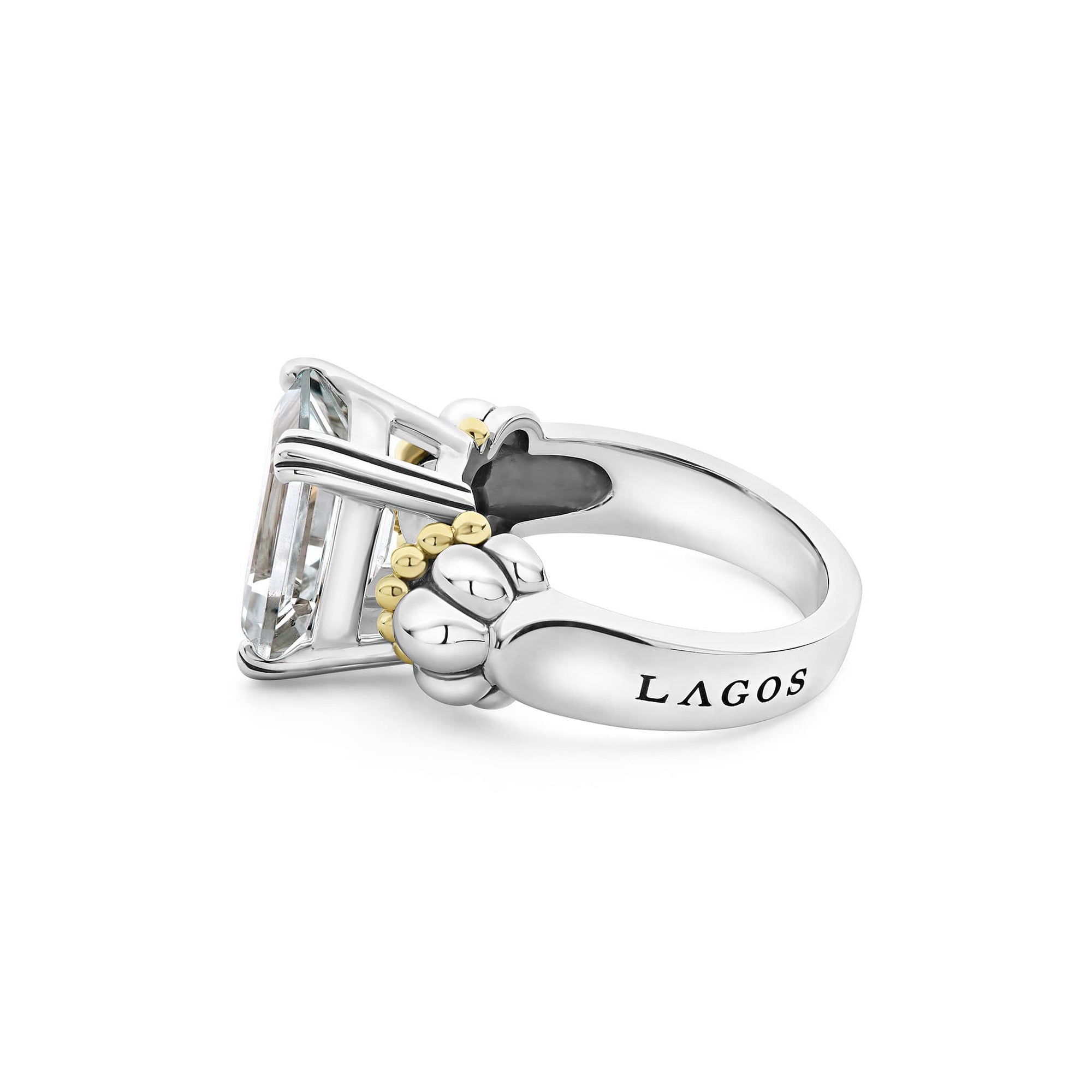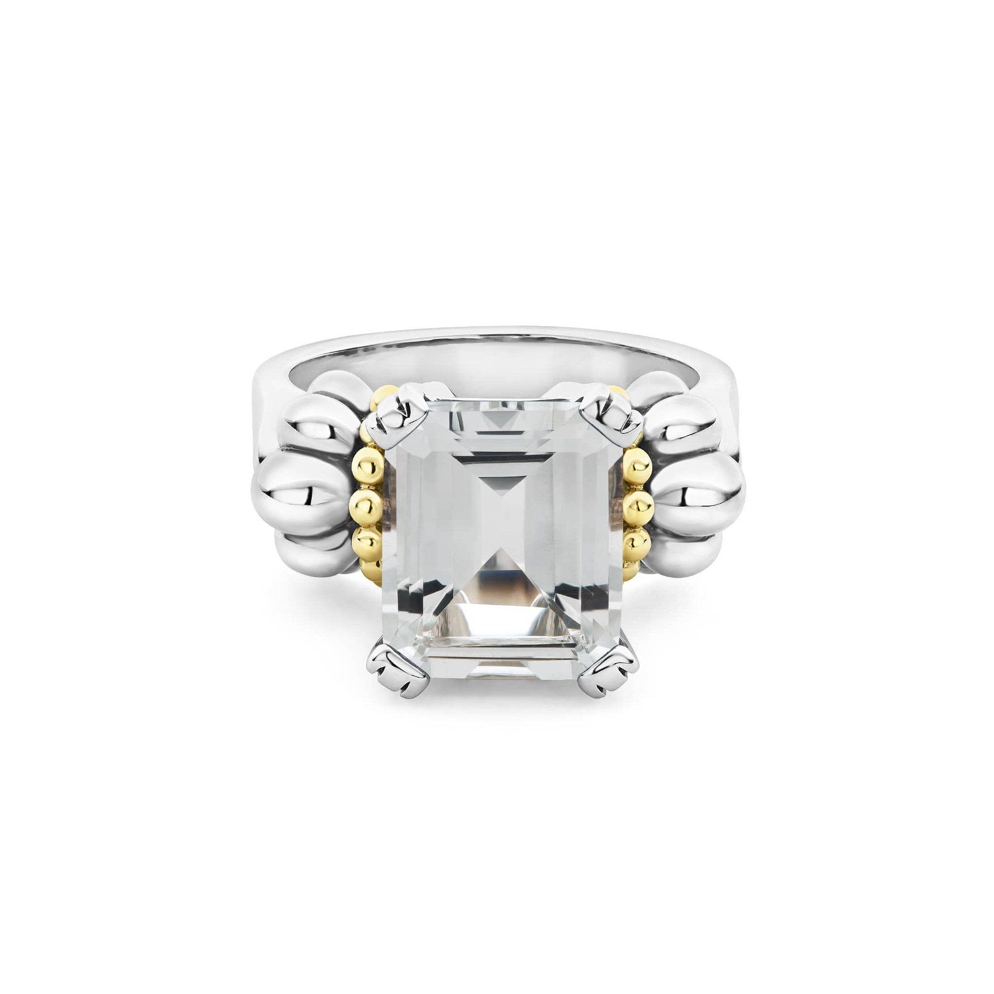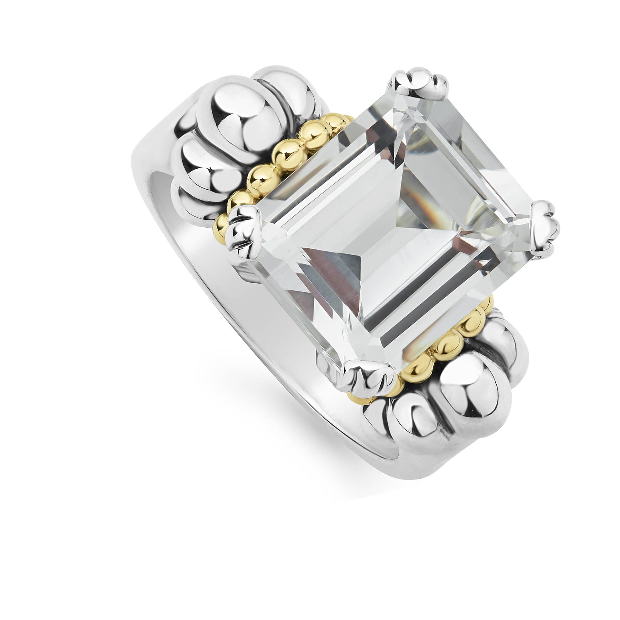 The return of a LAGOS icon. Our signature emerald-cut white topaz gemstone ring with a prong setting in sterling silver and 18K gold Caviar beading.
